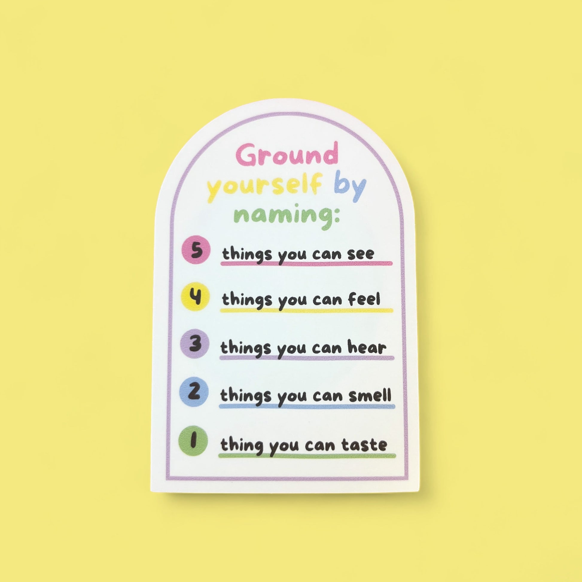 Feeling overwhelmed? Stay grounded and present with the 54321 Grounding Sticker! Add this colourful die-cut sticker to your anxiety toolkit. Featuring the powerful 54321 exercise, it uses your senses to bring you back to the present moment. Stick it somewhere it will prompt you to ground yourself whenever anxiety strikes.