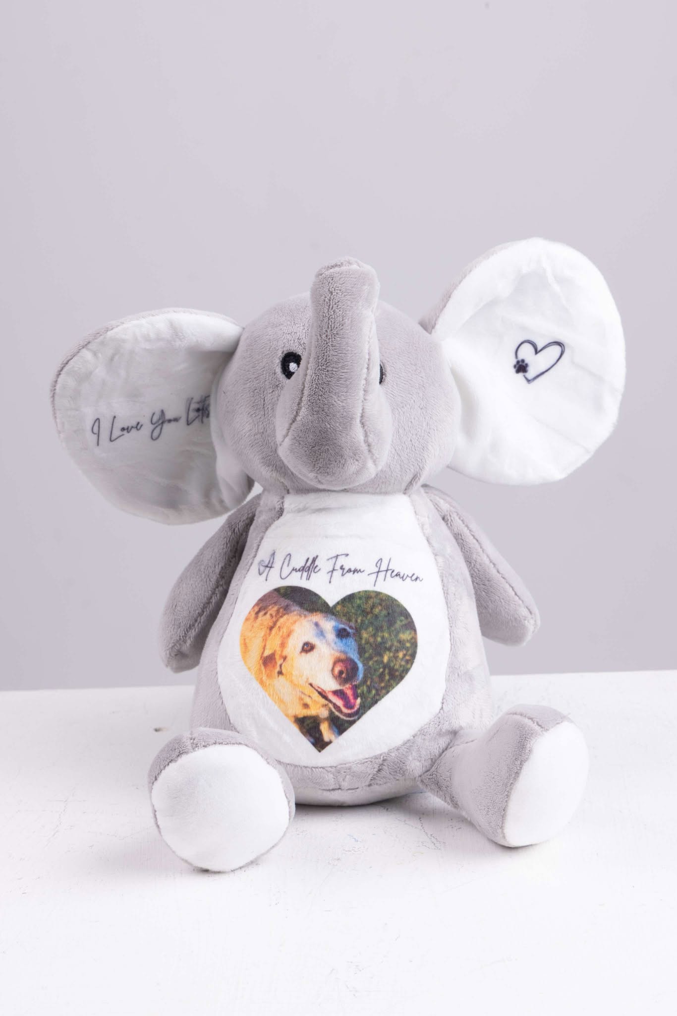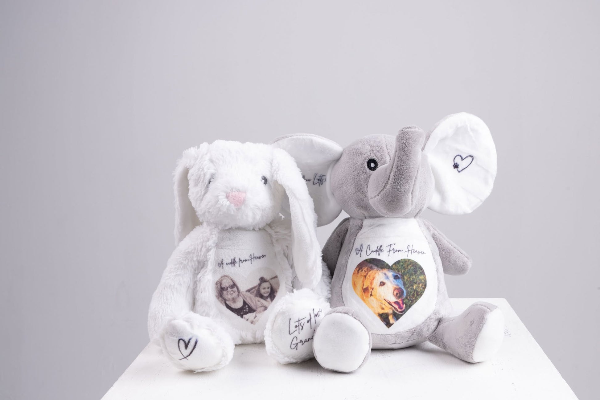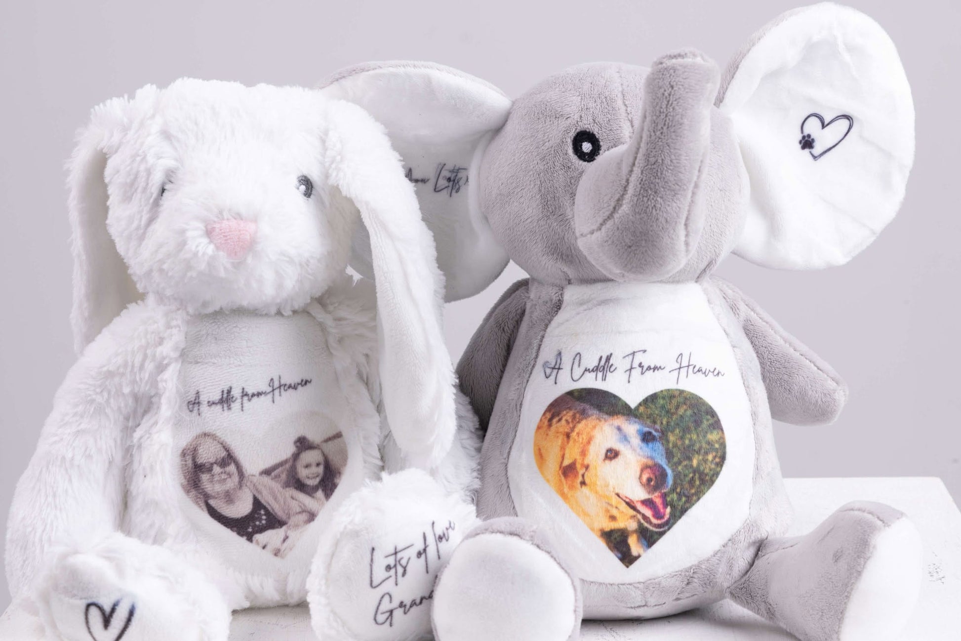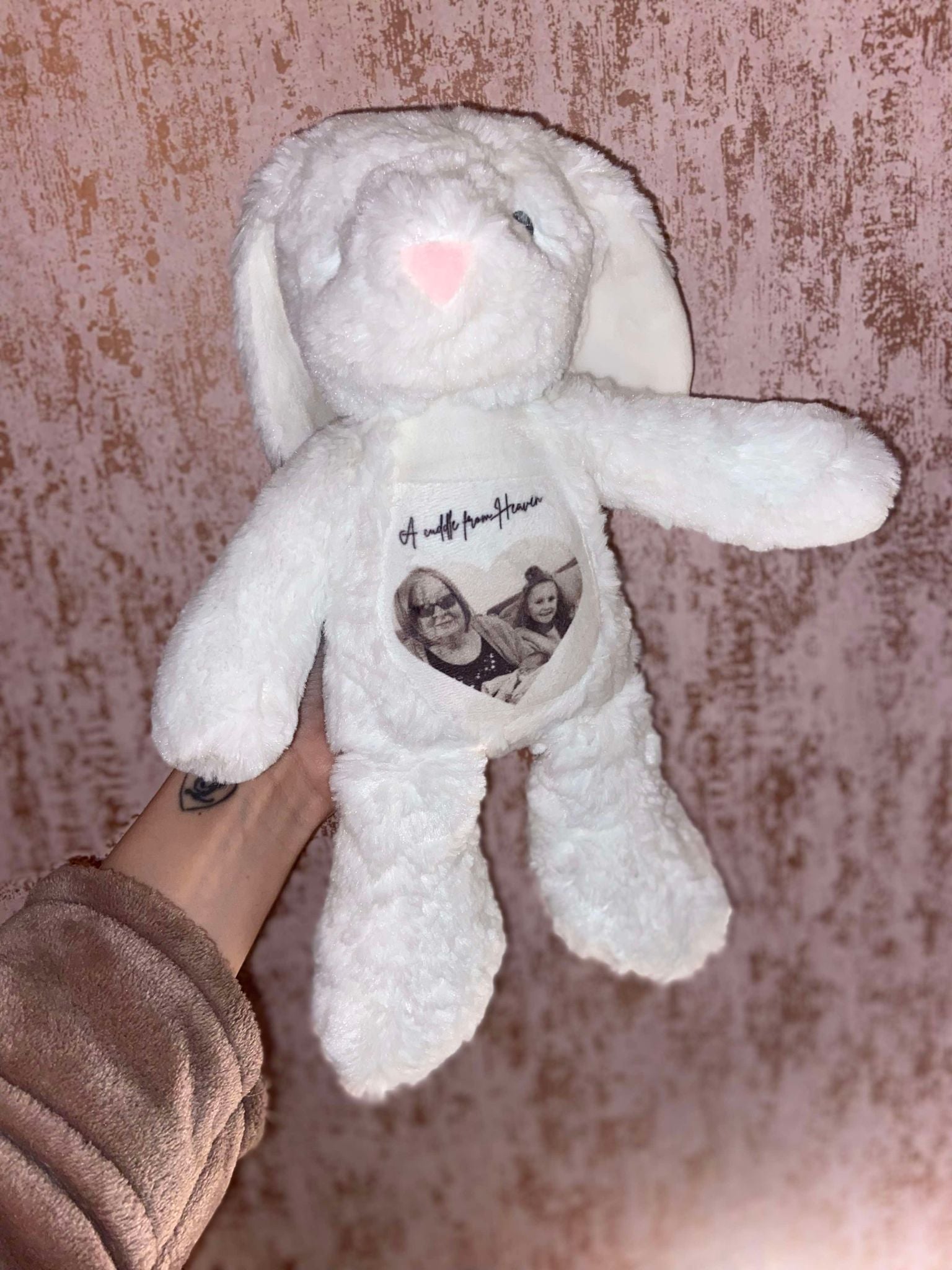 Keep the memory of your loved one close with our beautifully personalised Cuddle from Heaven Teddy. This soft and comforting teddy can be customised with a special photo of your loved one who has passed away, making it a heartfelt keepsake. The teddy bear features a special space for your photo and allows you to add a custom message—whether it's a simple "Miss you every day" or a heartfelt "With love from Grandma," we can print any text that brings you comfort.