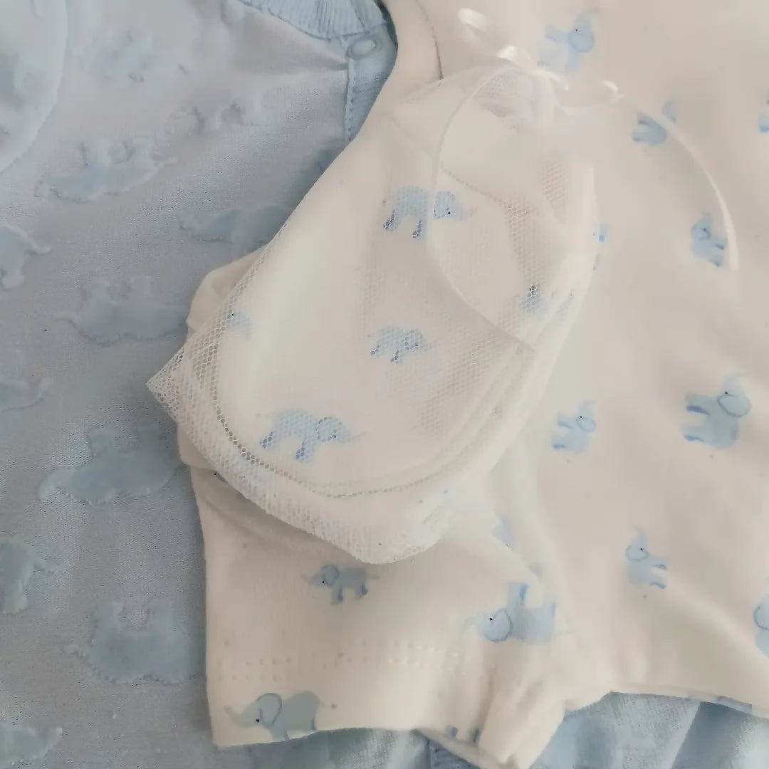 Included is an adorable Rockabye Baby Boutique five-piece set featuring a cute blue elephant print. The set includes a sleepsuit, a bodysuit, a hat, mittens and a matching bib.