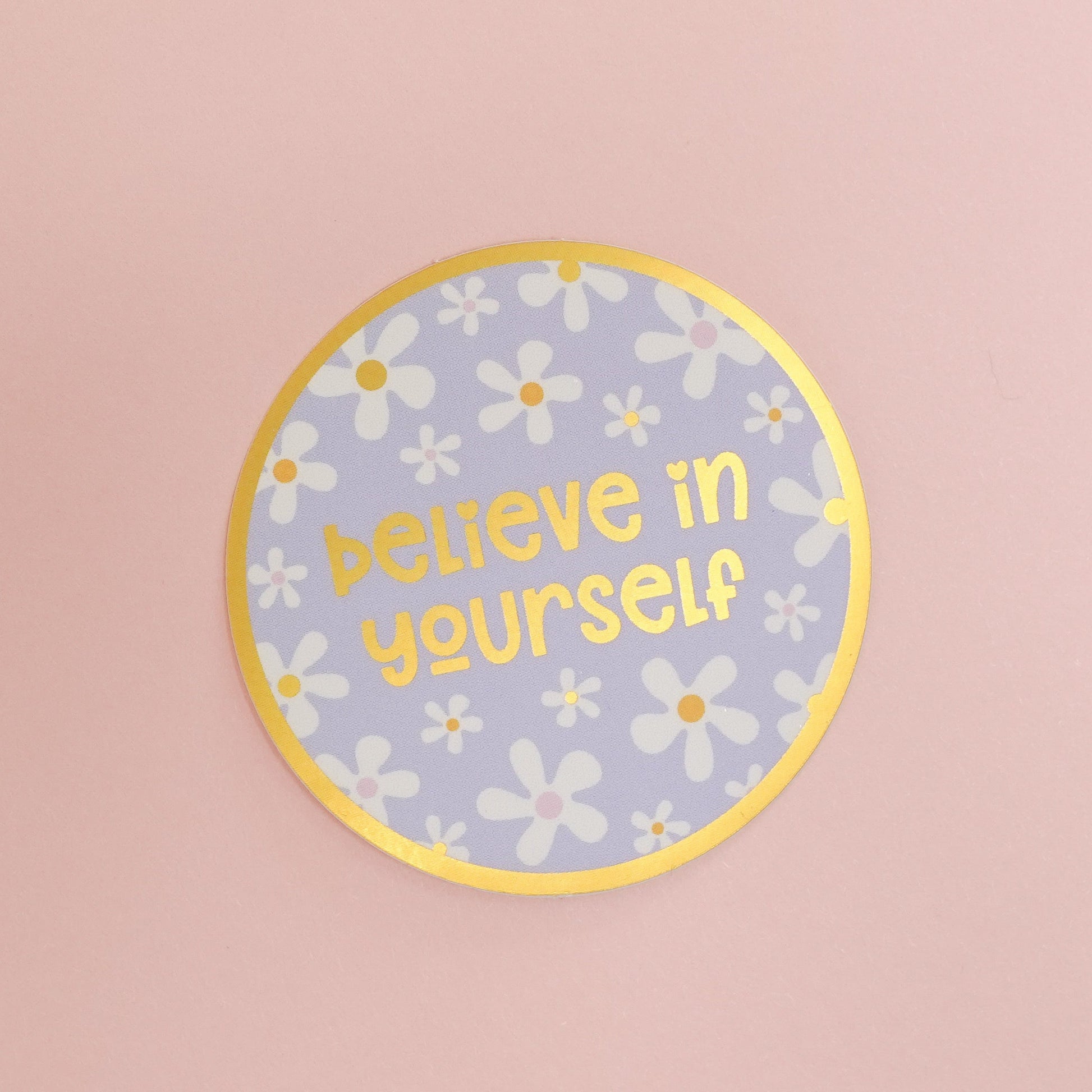 This circular Believe in Yourself die cut sticker features a pretty floral design and gold mirror accents.