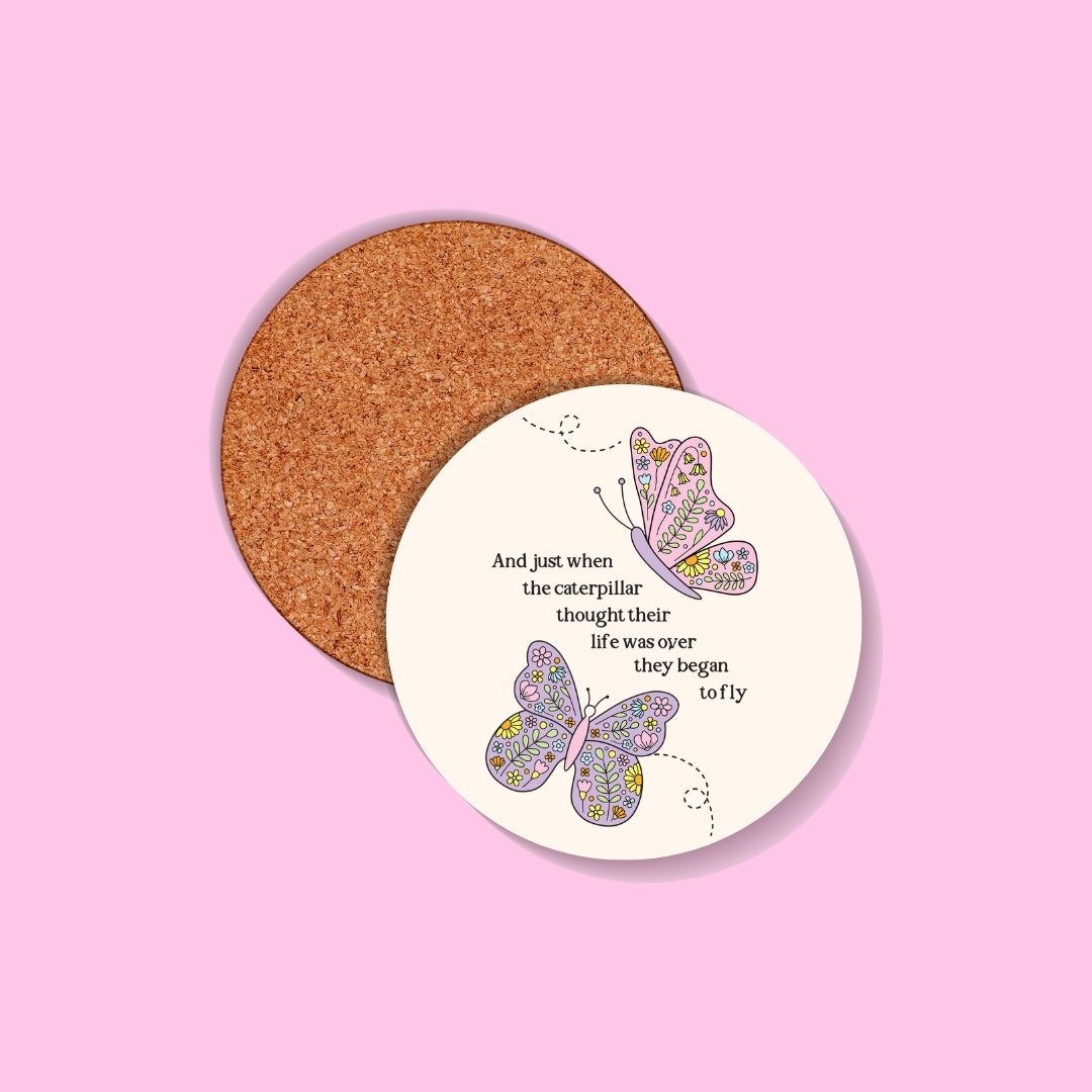Embrace the beauty of new beginnings with this elegant butterfly coaster. Featuring two exquisitely patterned butterflies in shades of pink and purple, this coaster carries a hopeful message: "And just when the caterpillar thought their life was over, they began to fly." It's a beautiful reminder of resilience, transformation, and the bright possibilities that lie ahead.