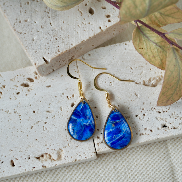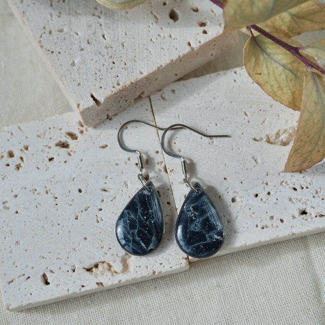 The creative process to craft the unique colour and stone like effect involves a mixture of translucent polymer clay, combined with an array of inks and metal leaf in such a way that achieves a one-of-a-kind finish. To complete the process, it is topped with a transparent resin to really highlight the colour and sparkle!