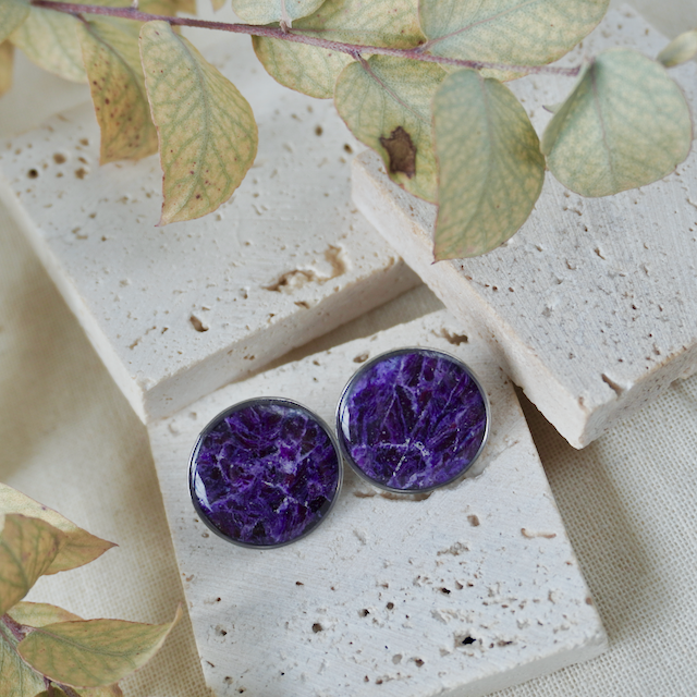 All of our jewellery is crafted by hand, so each has a unique finish making them one-of-a-kind pieces. The colour in the earring glows with vibrancy when the sun hits them.