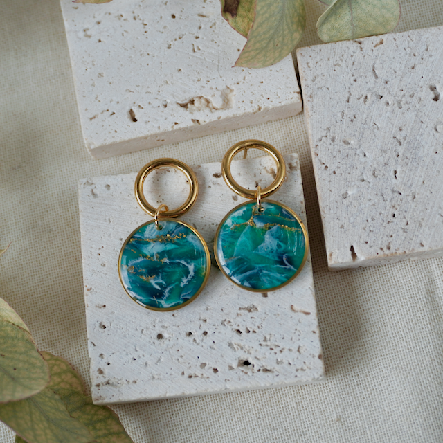The creative process to craft the unique colour and stone like effect involves a mixture of translucent polymer clay, combined with an array of inks and metal leaf in such a way that achieves a one-of-a-kind finish. To complete the process, it is topped with a transparent resin to really highlight the colour and sparkle!