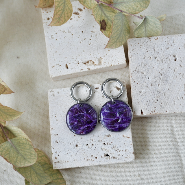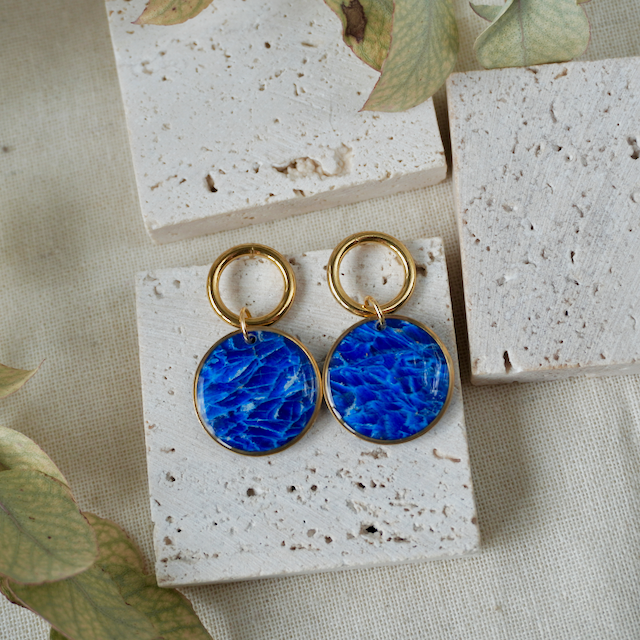 All of our jewellery is crafted by hand, so each has a unique finish making them one-of-a-kind pieces. The colour in the earring glows with vibrancy when the sun hits them.