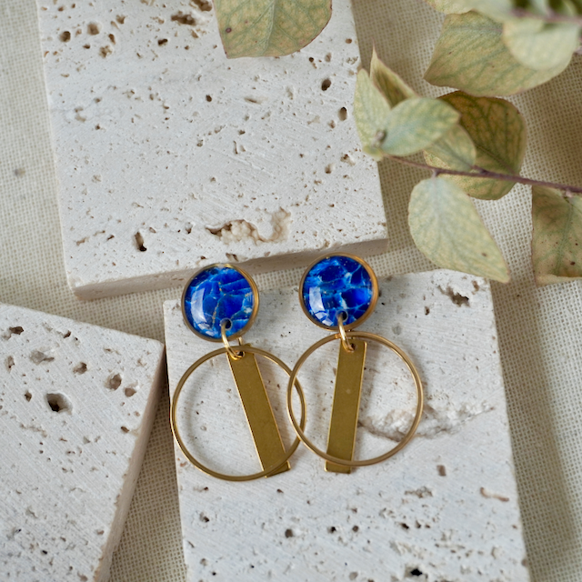 All of our jewellery is crafted by hand, so each has a unique finish making them one-of-a-kind pieces. The colour in the earring glows with vibrancy when the sun hits them.