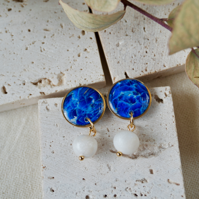 All of our jewellery is crafted by hand, so each has a unique finish making them one-of-a-kind pieces. The colour in the earring glows with vibrancy when the sun hits them.