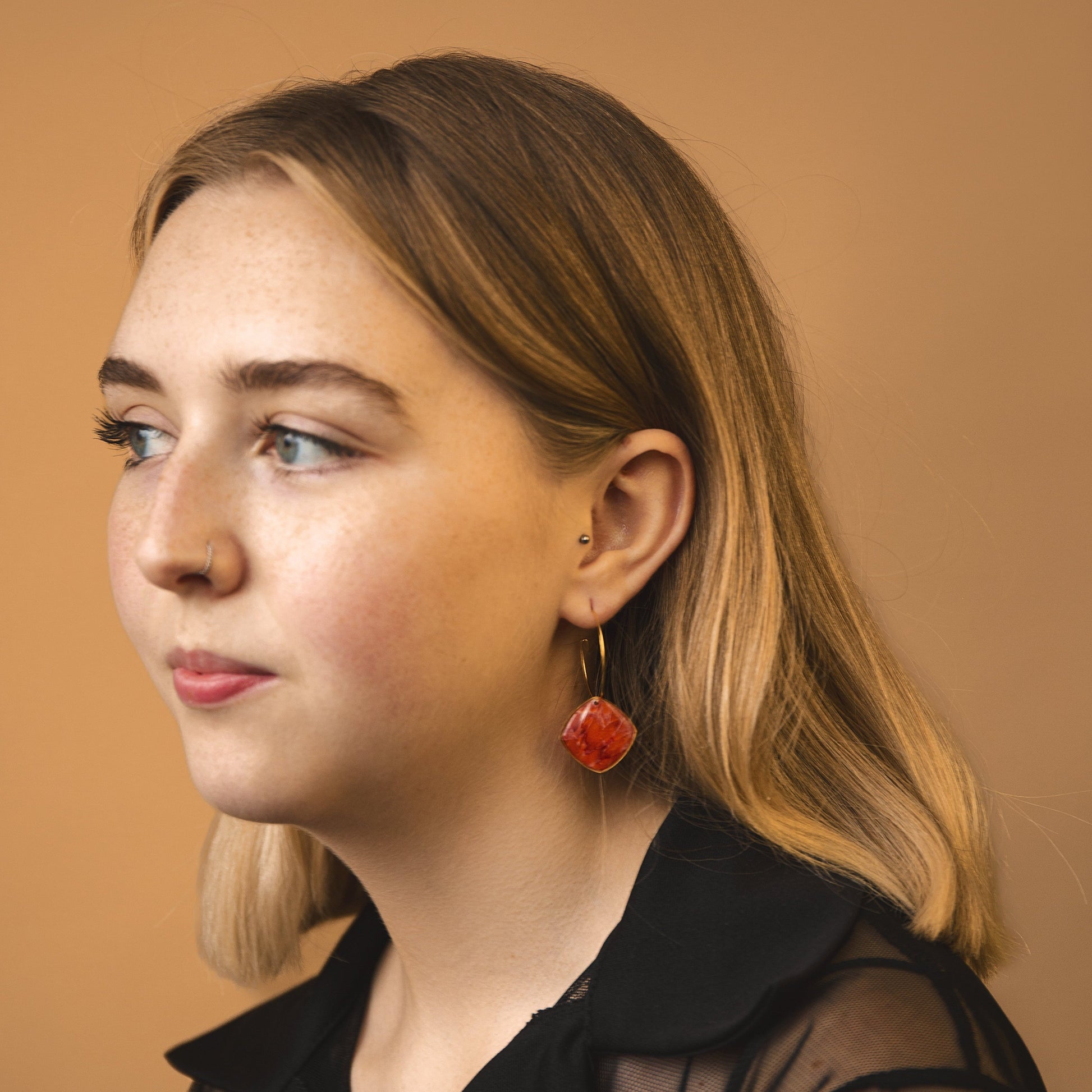 Check out our new thin hoop style modelled by the gorgeous Libby! Such a thin hoop supporting a stunningly light and bright rounded square of dazzling colour. Ideal to catch anyone's eye!