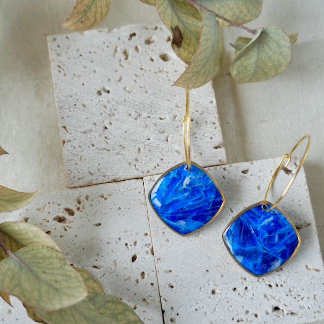 All of our jewellery is crafted by hand, so each has a unique finish making them one-of-a-kind pieces. The colour in the earring glows with vibrancy when the sun hits them.