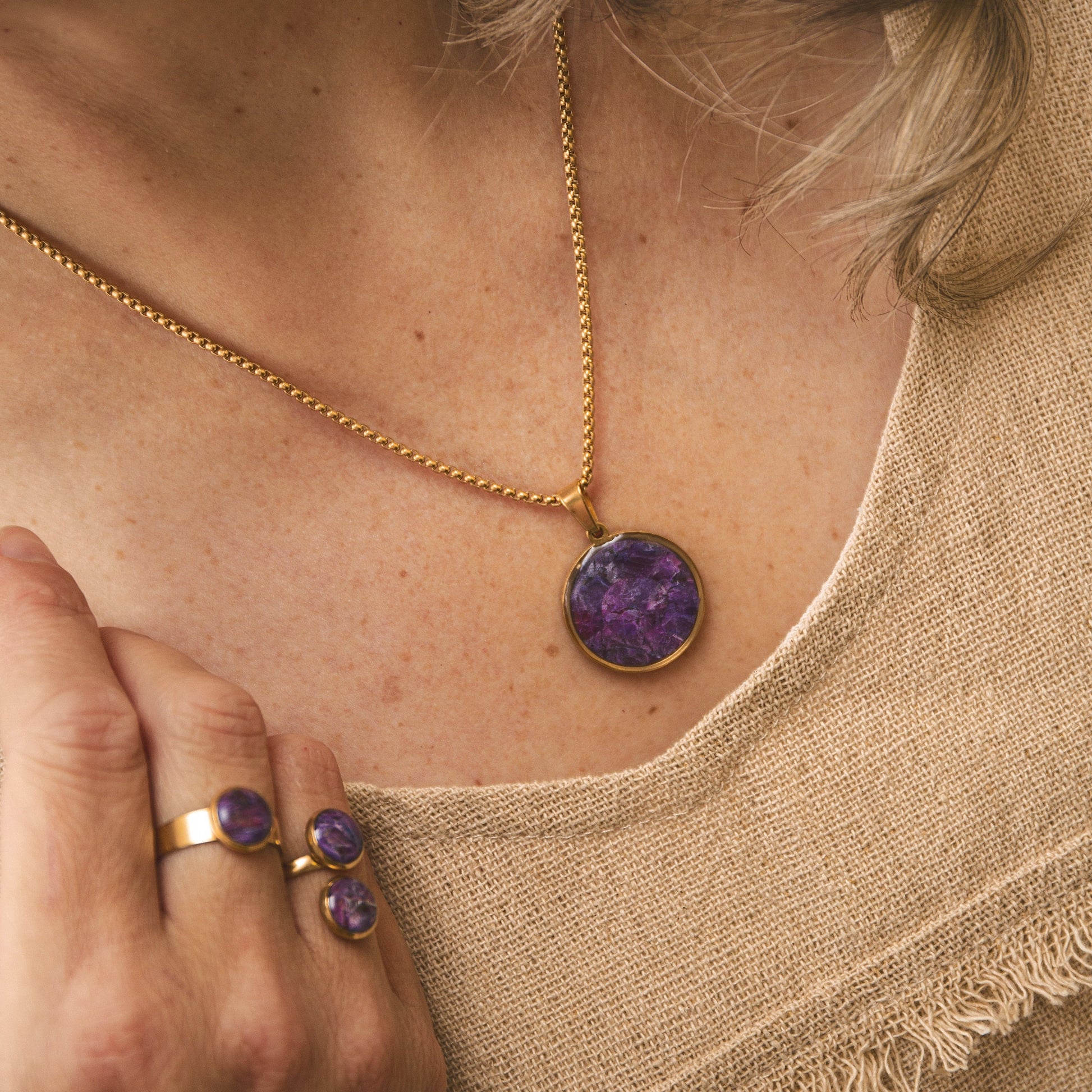 Provided on a 60cm length stainless steel chain, this necklace is perfect for those seeking something a little lower hanging on that special occasion. The 20mm pendant tray allows the deep colour of the 'stone' to truly capture the light, and attention!
