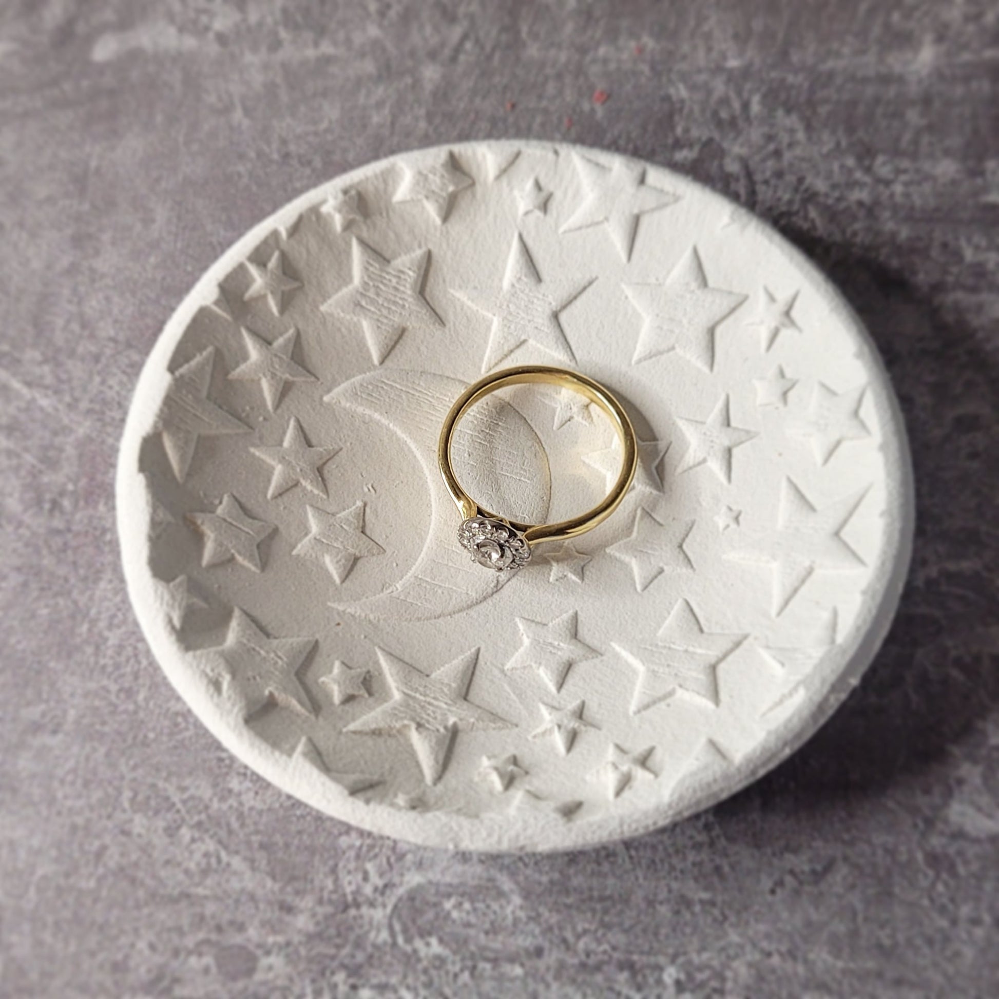 Made from air-drying clay, it's lightweight and robust, with a tactile matte finish and embossed celestial pattern of stars and moons. Each dish is cut from a larger patterned slab, so every dish is unique and may differ slightly from the images shown.