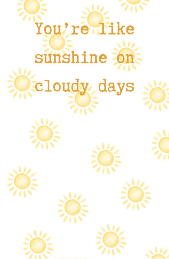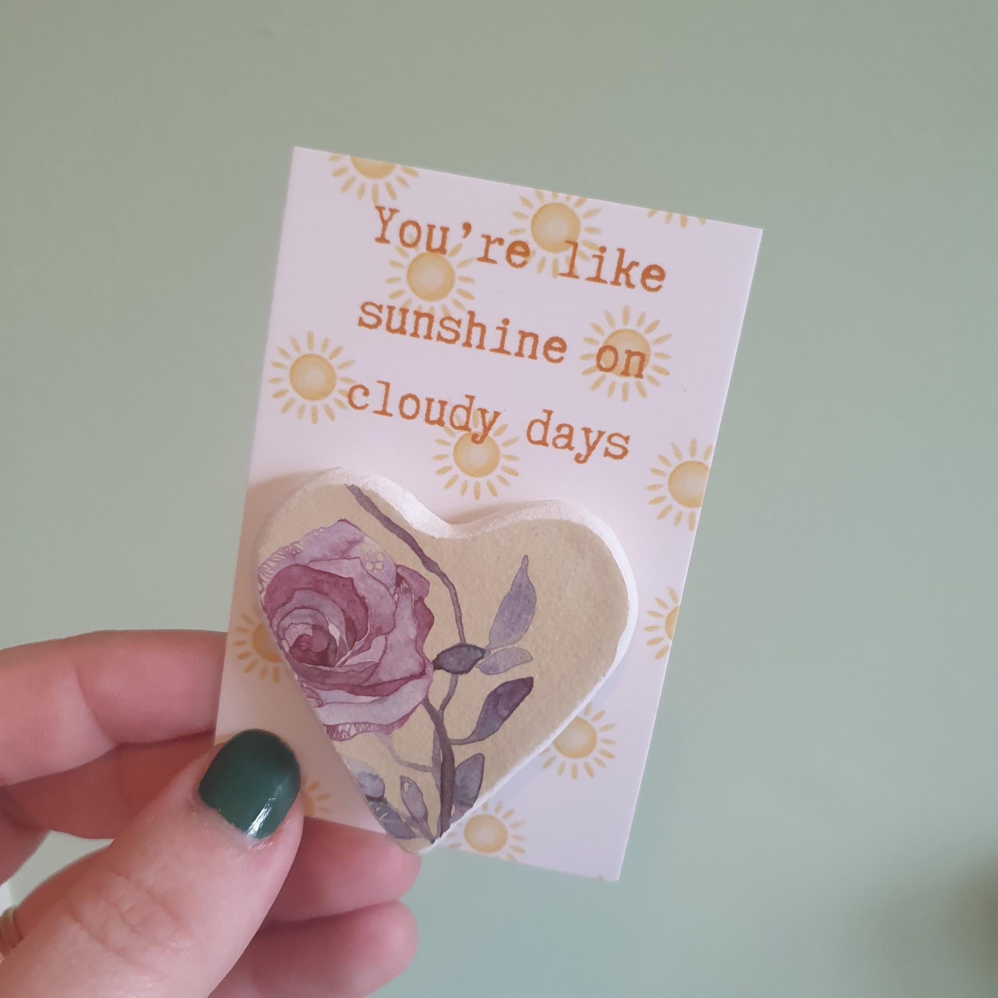 The clay heart is handmade from clay and decoupaged on one side in a lemon yellow paper with birds, roses or other natural elements. Please note that each heart features a small section of a larger pattern. The card reads 'You're like sunshine on cloudy days'.
