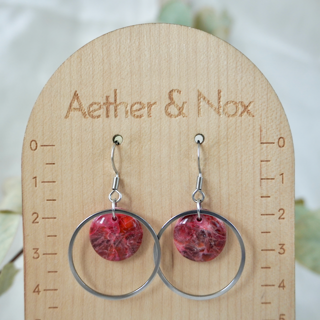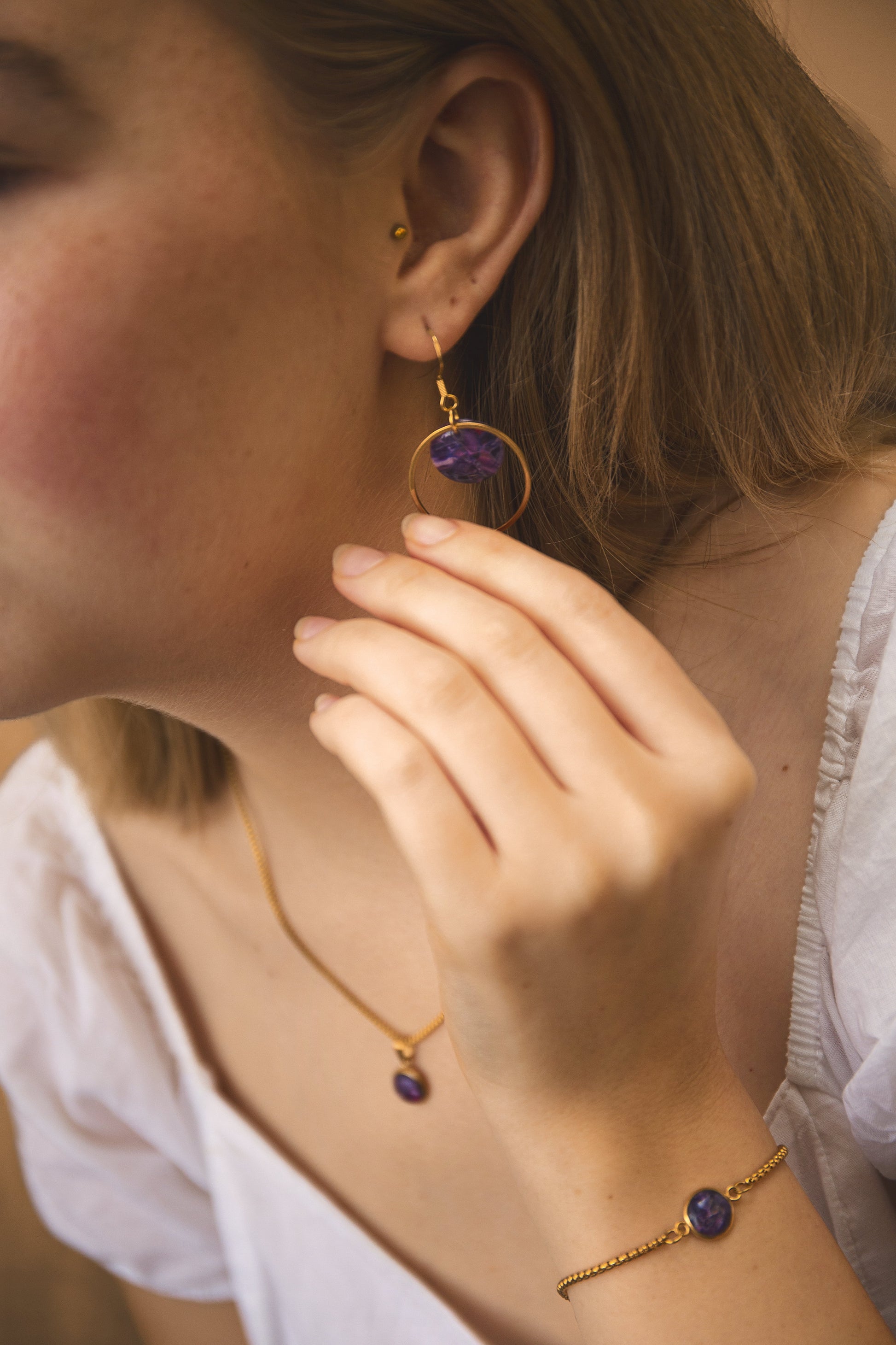 All of our jewellery is crafted by hand, so each has a unique finish making them one-of-a-kind pieces. The colour in the earring glows with vibrancy when the sun hits them.