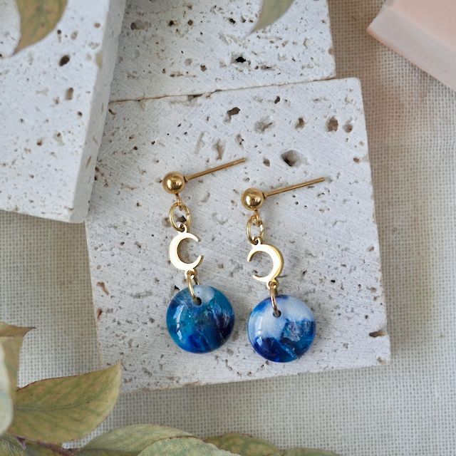 The creative process to craft the unique colour and stone like effect involves a mixture of translucent polymer clay, combined with an array of inks in such a way that achieves a one-of-a-kind finish. To complete the process, it is topped with a transparent resin to really highlight the colour and sparkle!