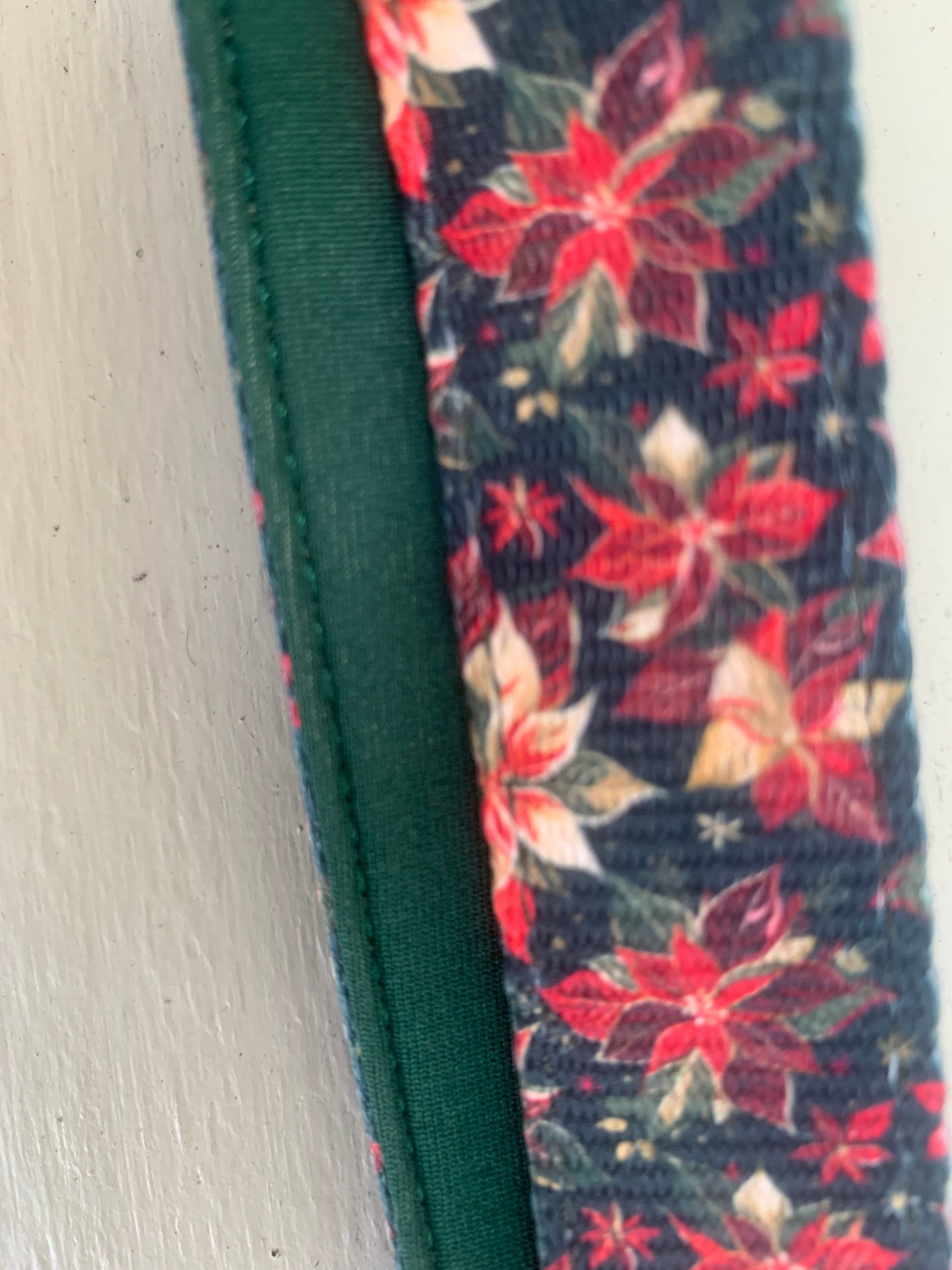 Our beautiful Poinsettia collar combines sturdy durability with festive flair. Featuring a charming Christmas poinsettia design, this collar is built to last through all your pet’s winter adventures An ideal present and perfect for keeping our furry friend safe and stylish during the festive season.