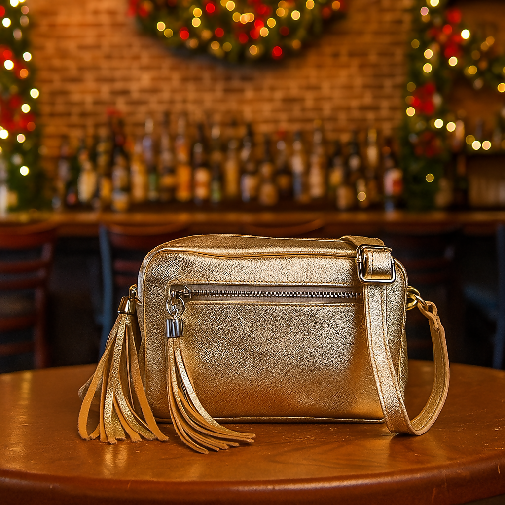 Turn heads with our gold metallic leather crossbody bag - the ultimate accessory for festive nights out and beyond.
