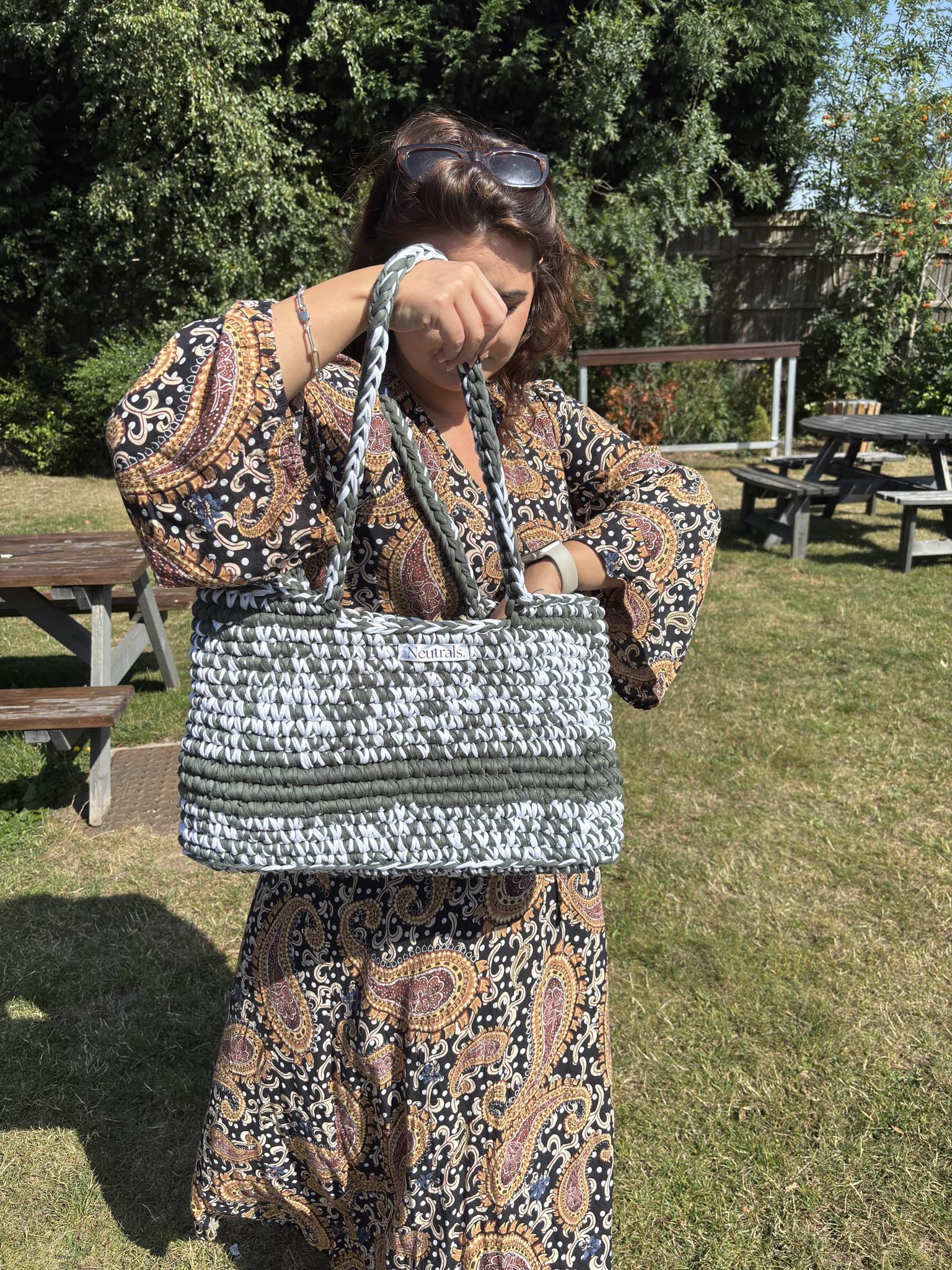 Crafted from chunky, recycled T-shirt yarn, this one-of-a-kind bag brings bold texture and effortless style. Handmade in calming earth tones and designed for real life — whether it’s a market trip, picnic, or everyday carry.