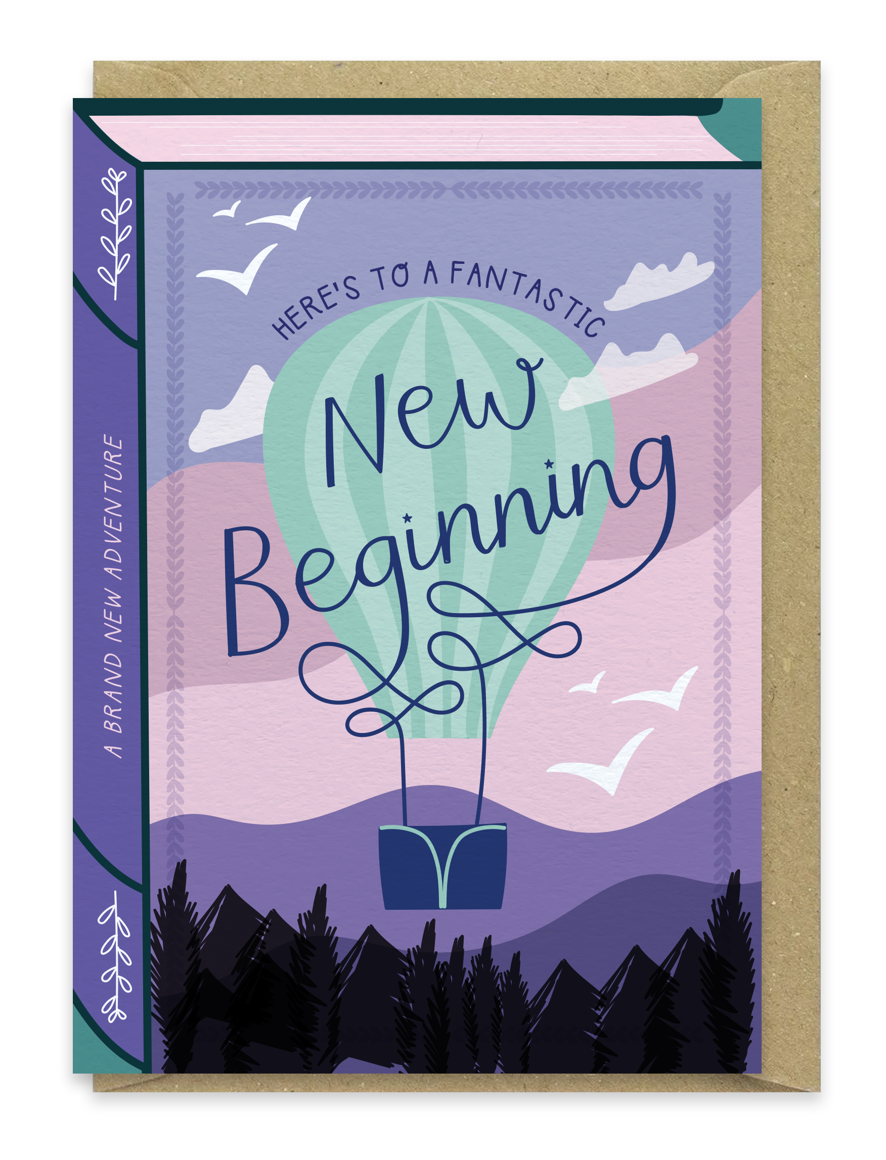 Inspired by the charm of vintage book covers, this beautifully illustrated greeting card is the perfect way to celebrate life’s big changes and exciting new chapters. The cover features a hot air balloon rising over sunlit mountains, paired with the uplifting message: “Here’s to a fantastic New Beginning.”