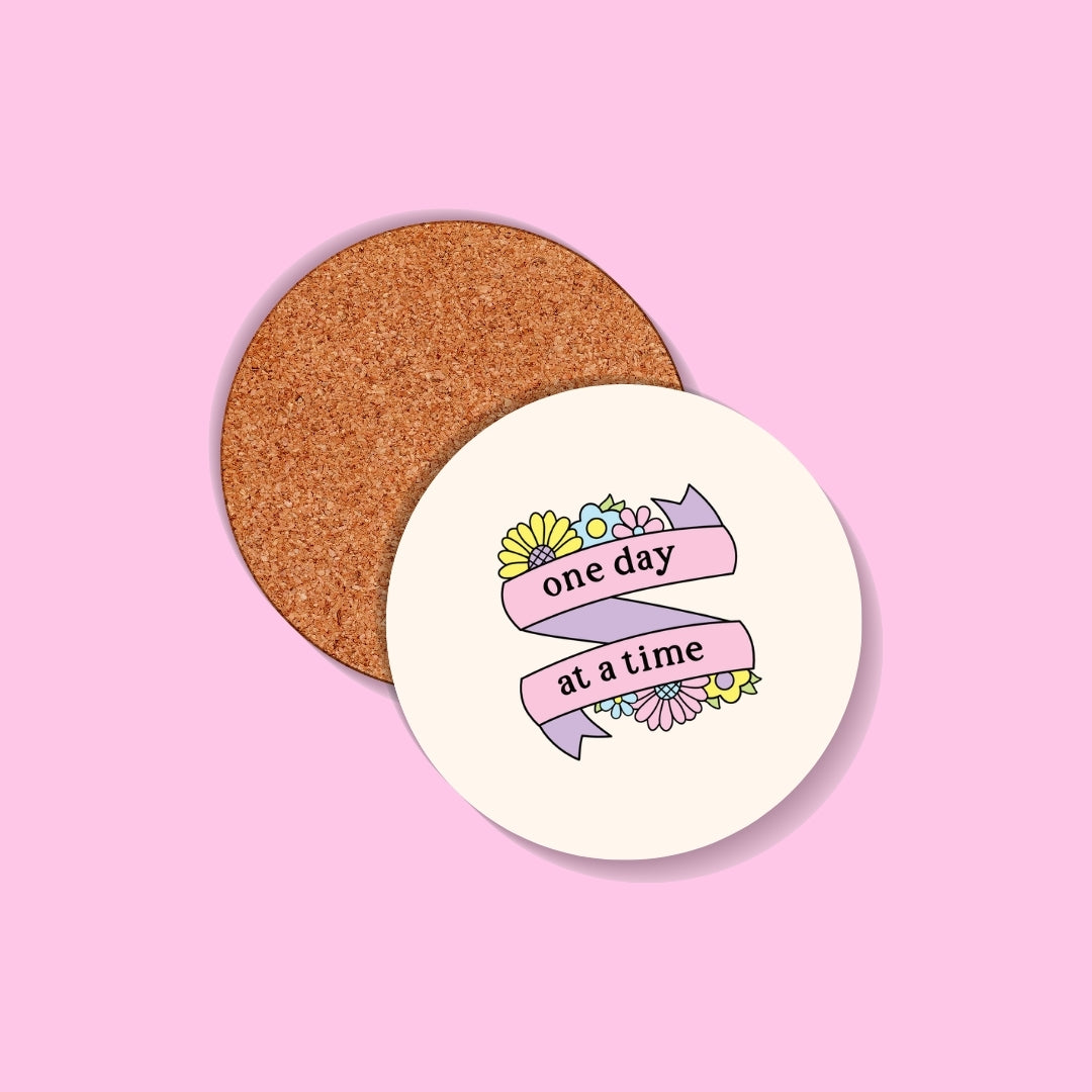 Embrace a moment of calm and mindfulness with this beautifully designed coaster, featuring a delicate floral arrangement and a gentle pink banner that reminds us to take things "one day at a time." It's a lovely, supportive message perfect for your daily routine.