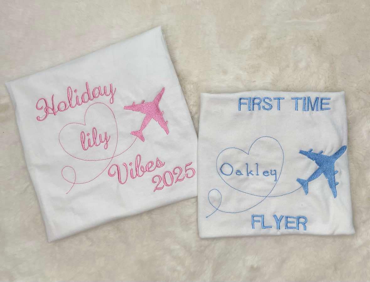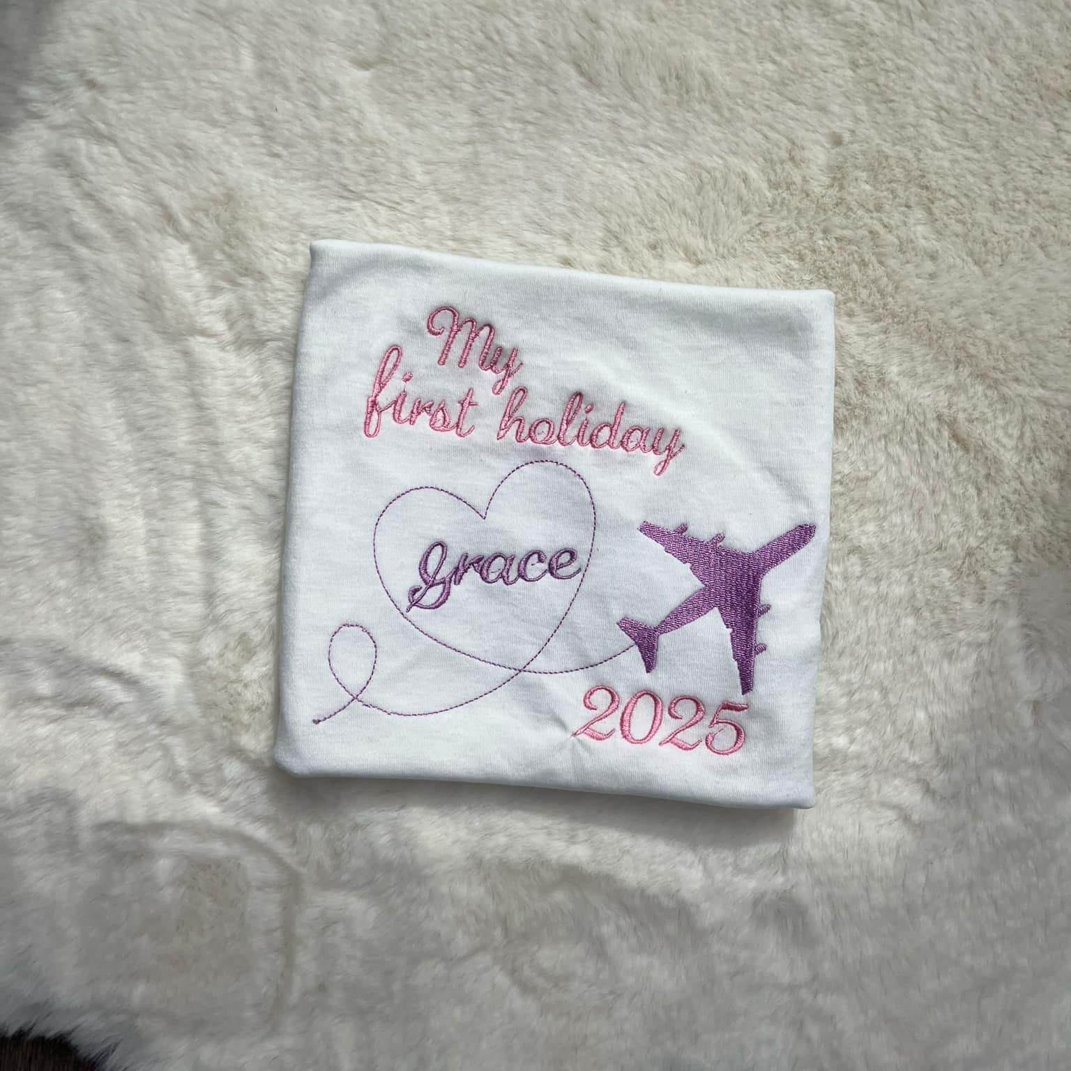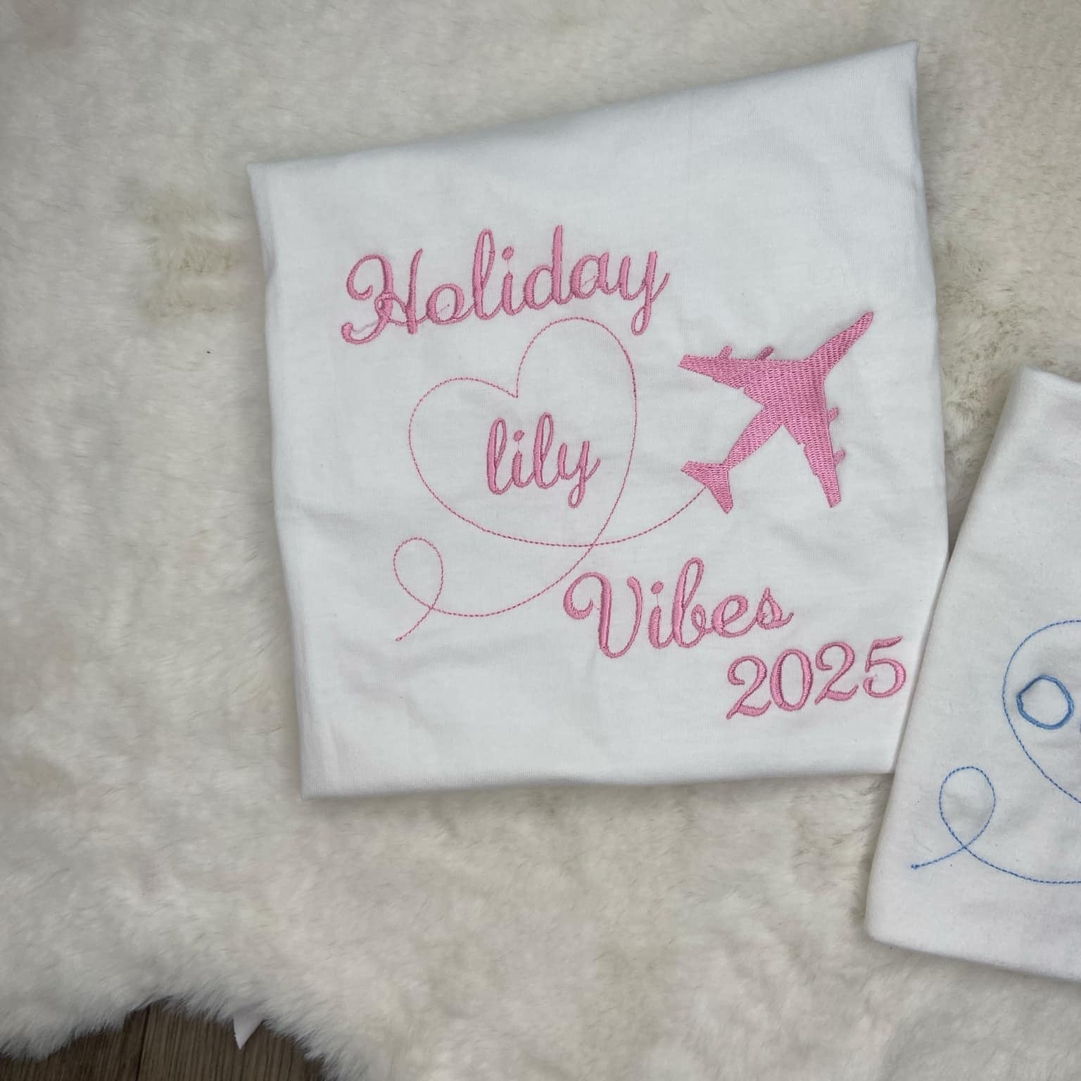 These lovely children's t-shirts add an extra touch to any first holiday or holiday. You can personalise the t-shirt with first time flyer, Holiday Vibes or My First Holiday and your child's name and year is optional. Choose from a range of thread colours and even mix and match. T-shirts are available in 6 -12 months to 11 years