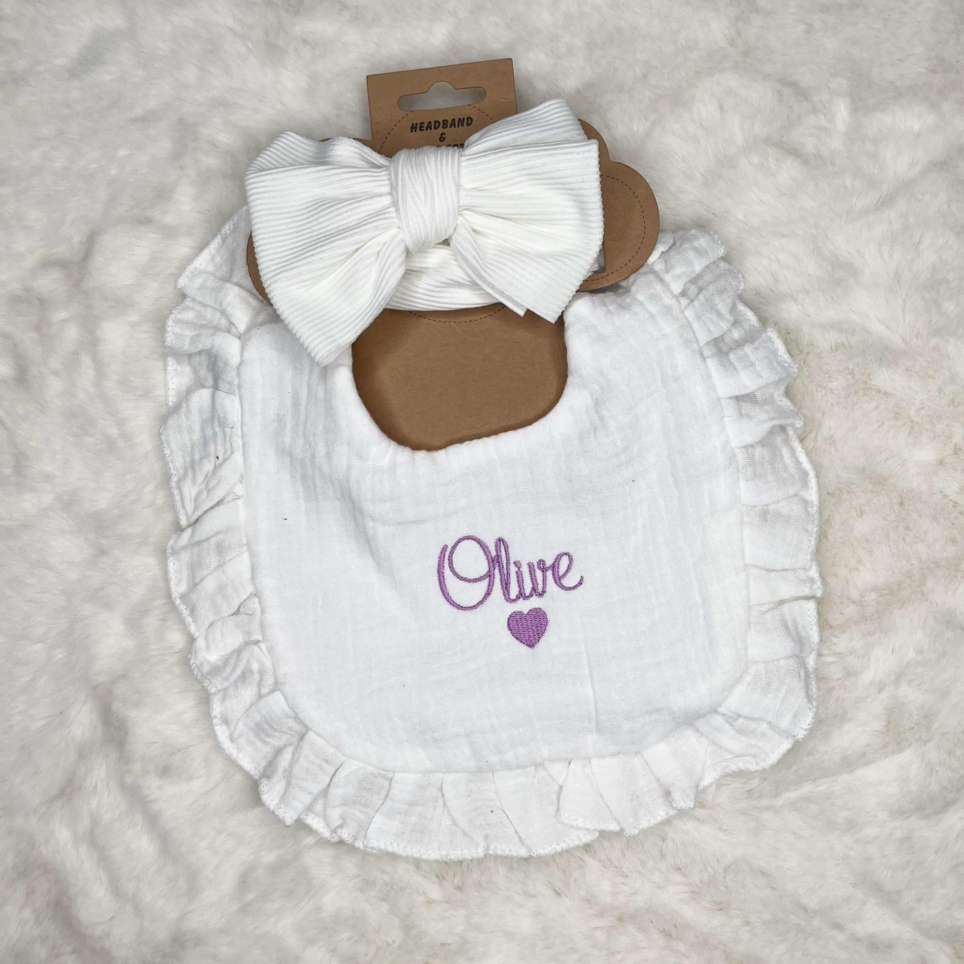 Personalised Frilled Embroidered Baby Bib & Headband Set