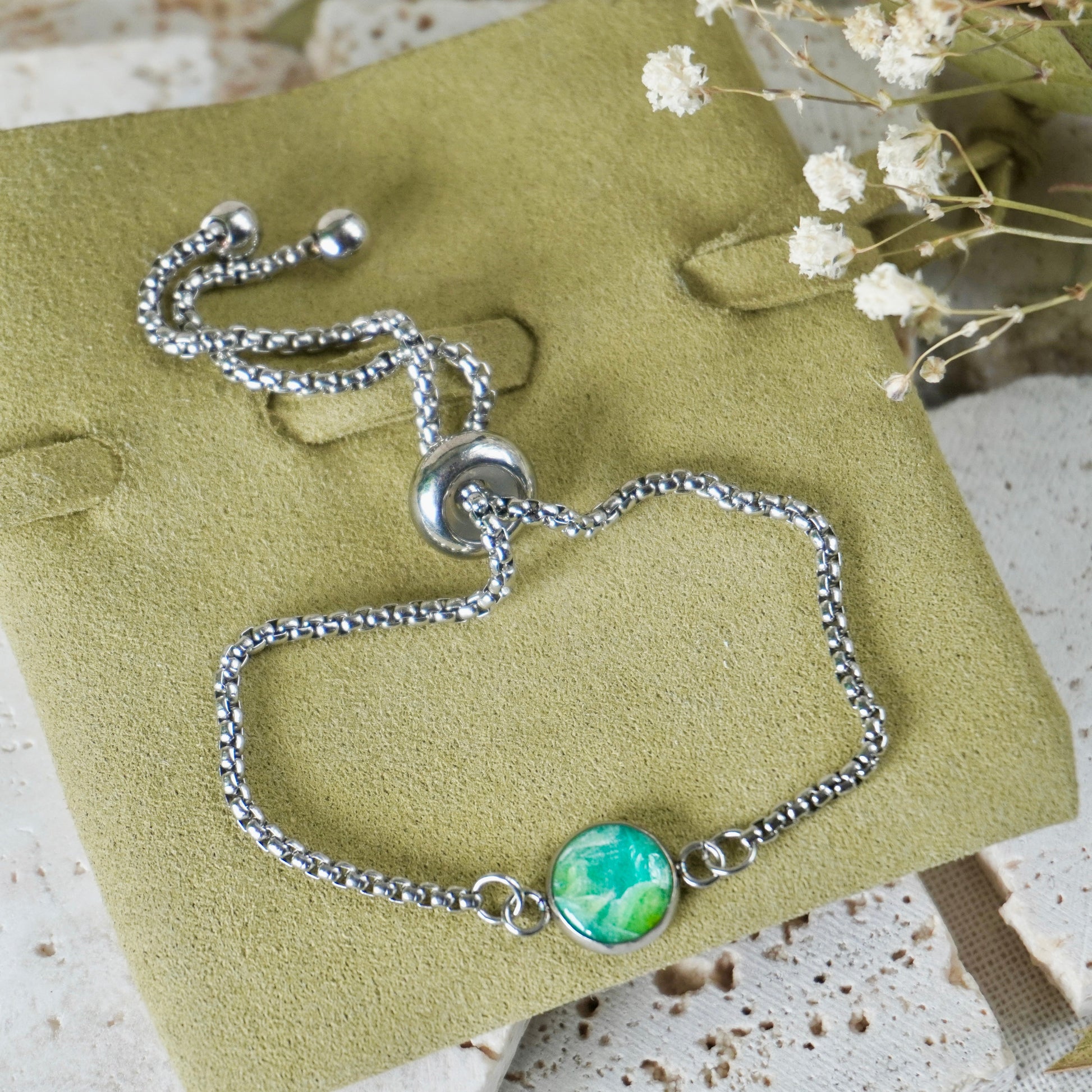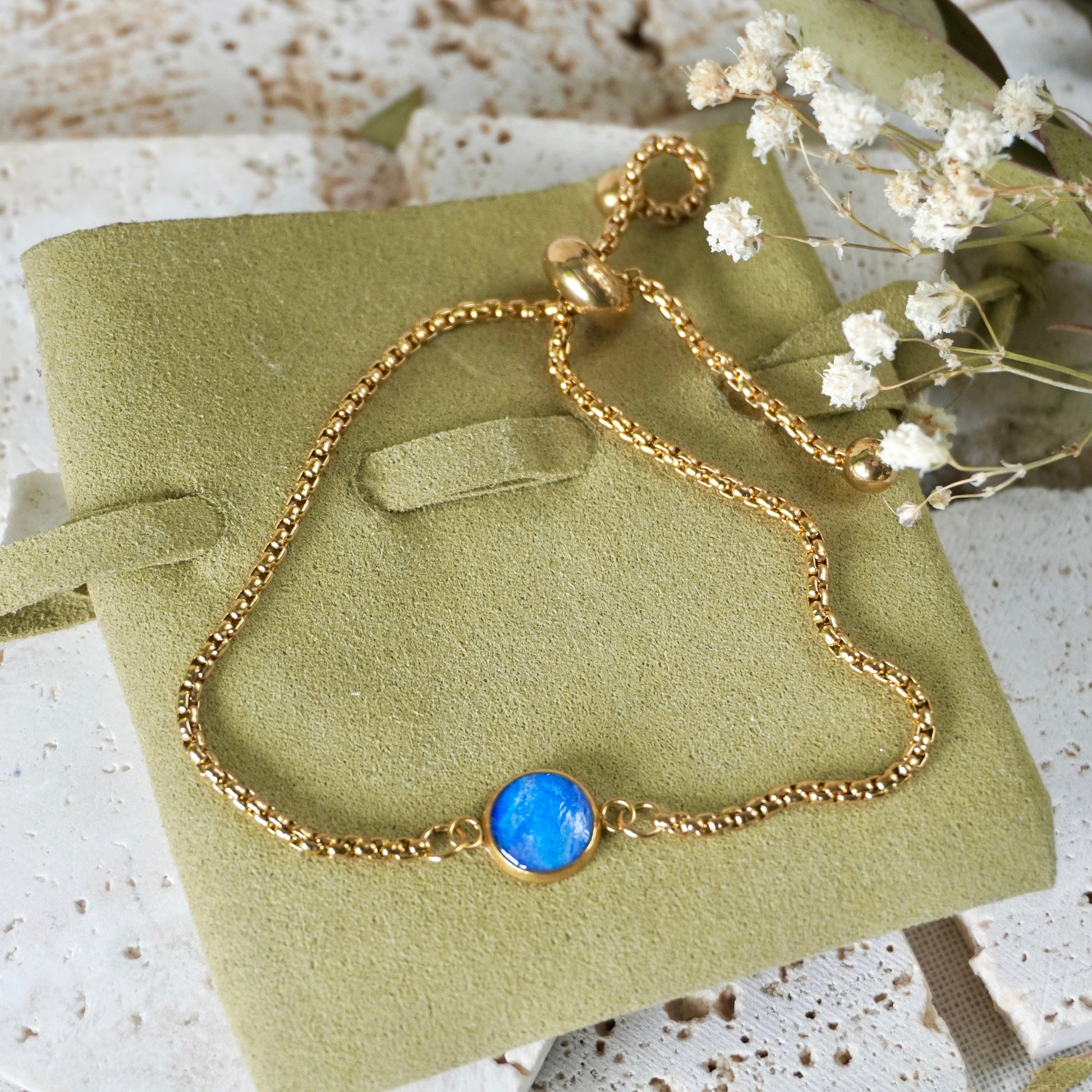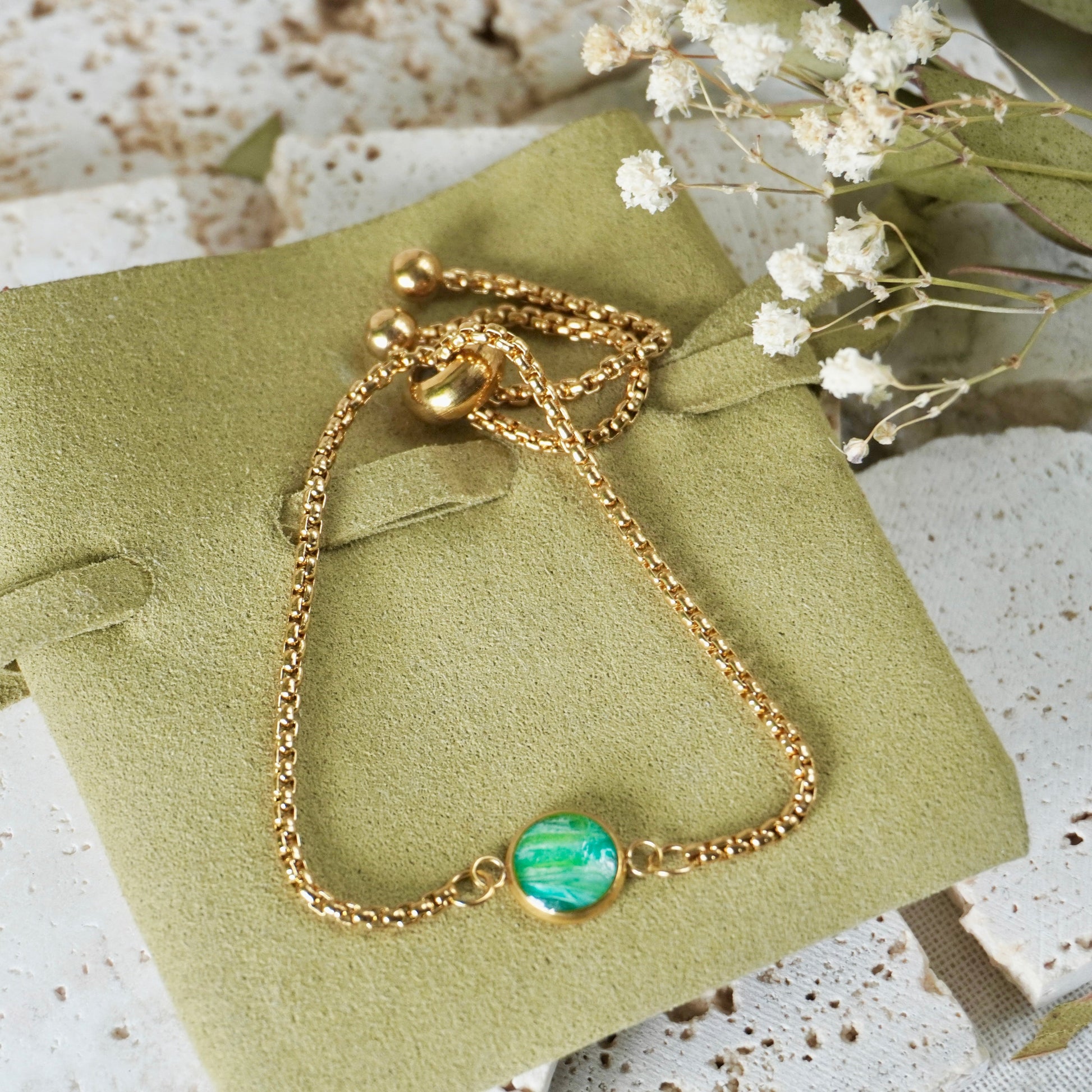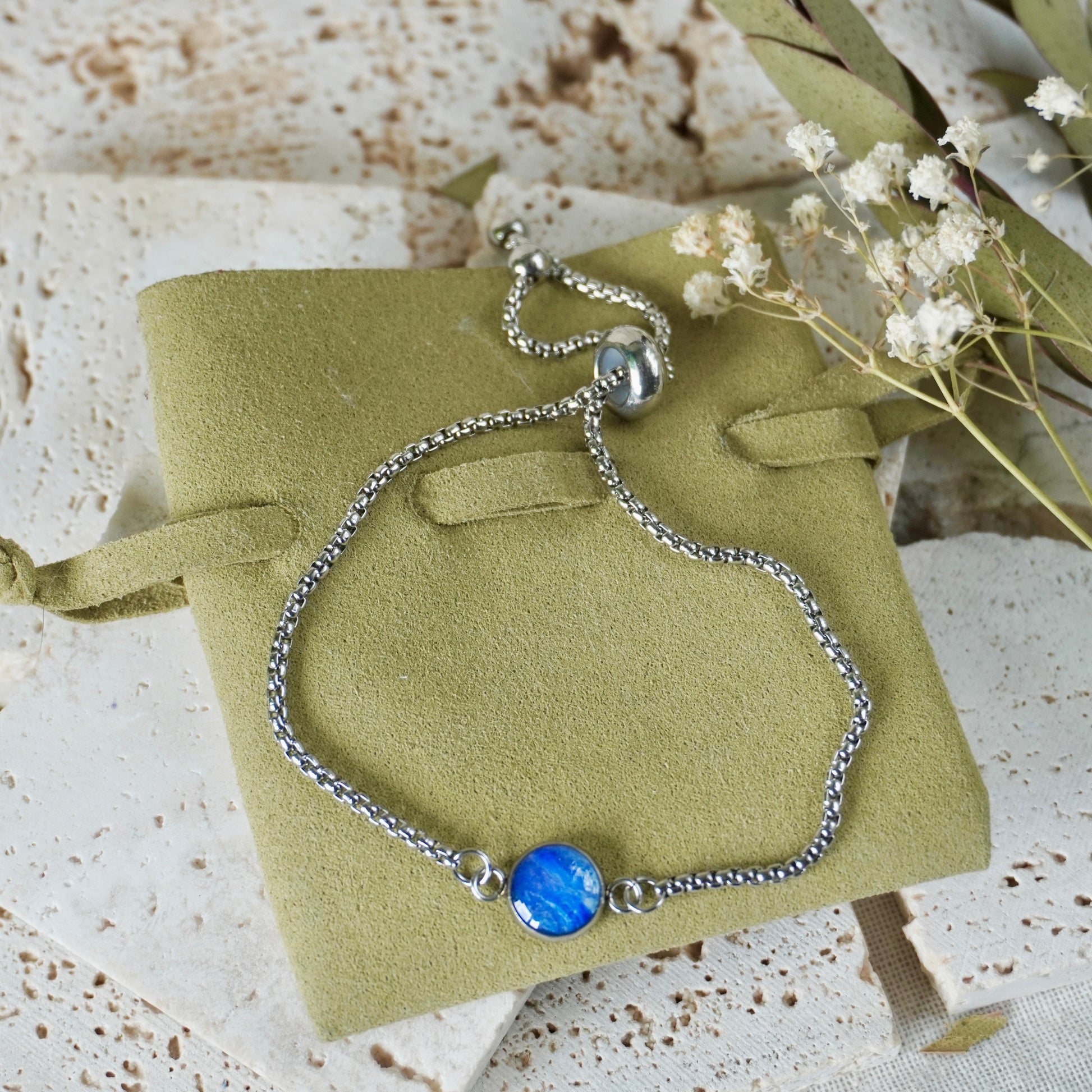 These demure bracelets are the ultimate self-gift! The central 10mm 'stone' just dazzles across the thin yet strong bracelet chain. Handcrafted with care, the stone promises a unique look. The 22cm chain and donut clasp makes it adjustable. A stargazer's dream!