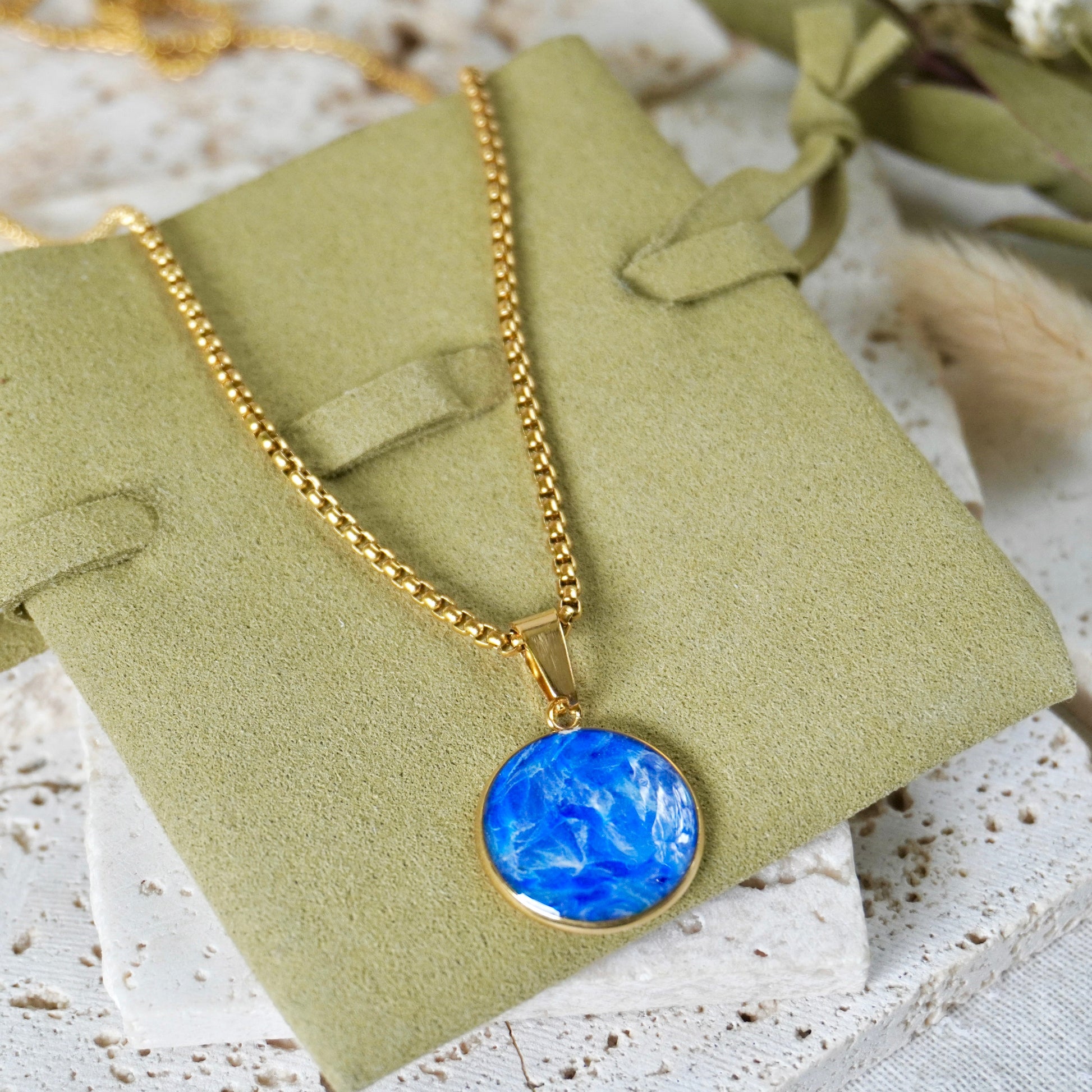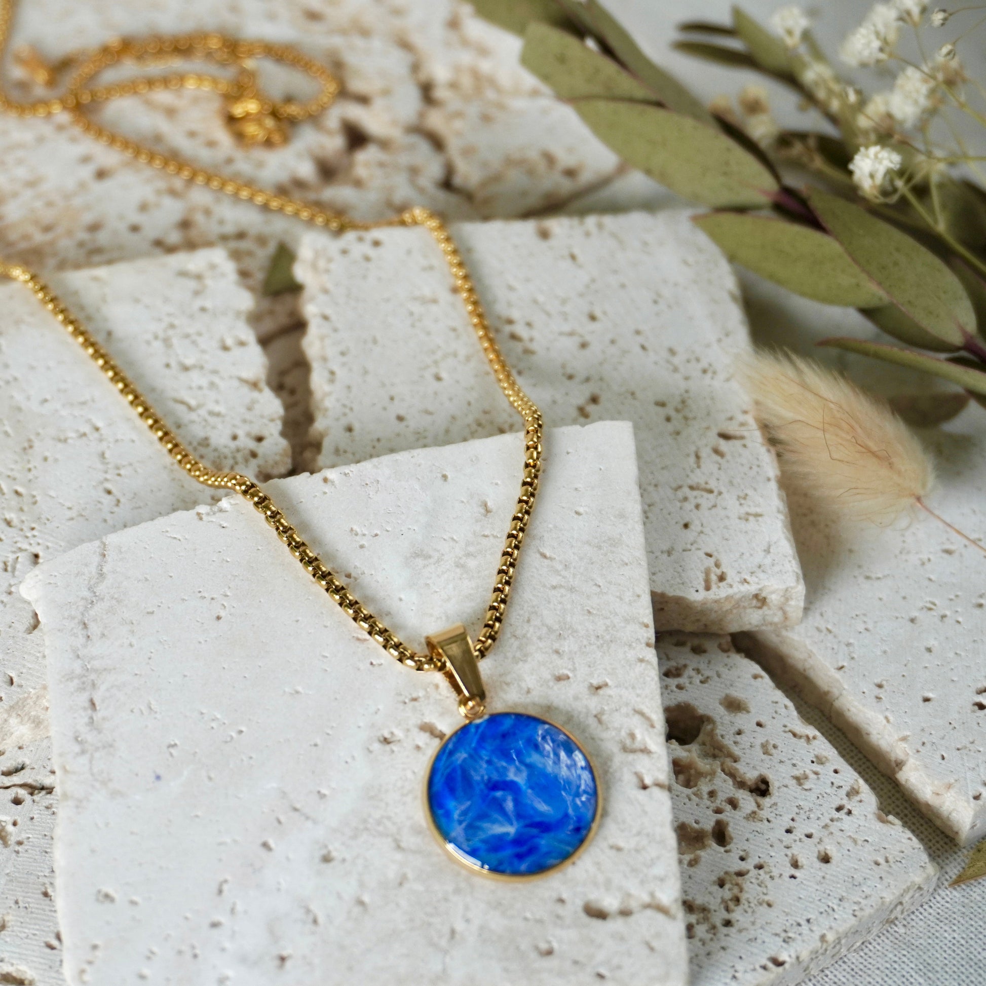 The stone of the pendant is crafted by hand, giving it a unique finish. On a 45cm (18 inches) chain and boasts a 16mm diameter stone. The chain can also be adjusted up to 50cm (20 inches).