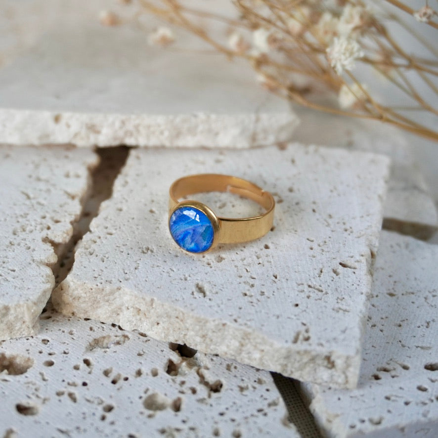 The creative process to craft the unique colour and stone like effect involves a mixture of translucent polymer clay, combined with an array of inks and gold leaf in such a way that achieves a one-of-a-kind finish. Once this is set in the band, this is topped with a resin to really highlight the colour and sparkle!