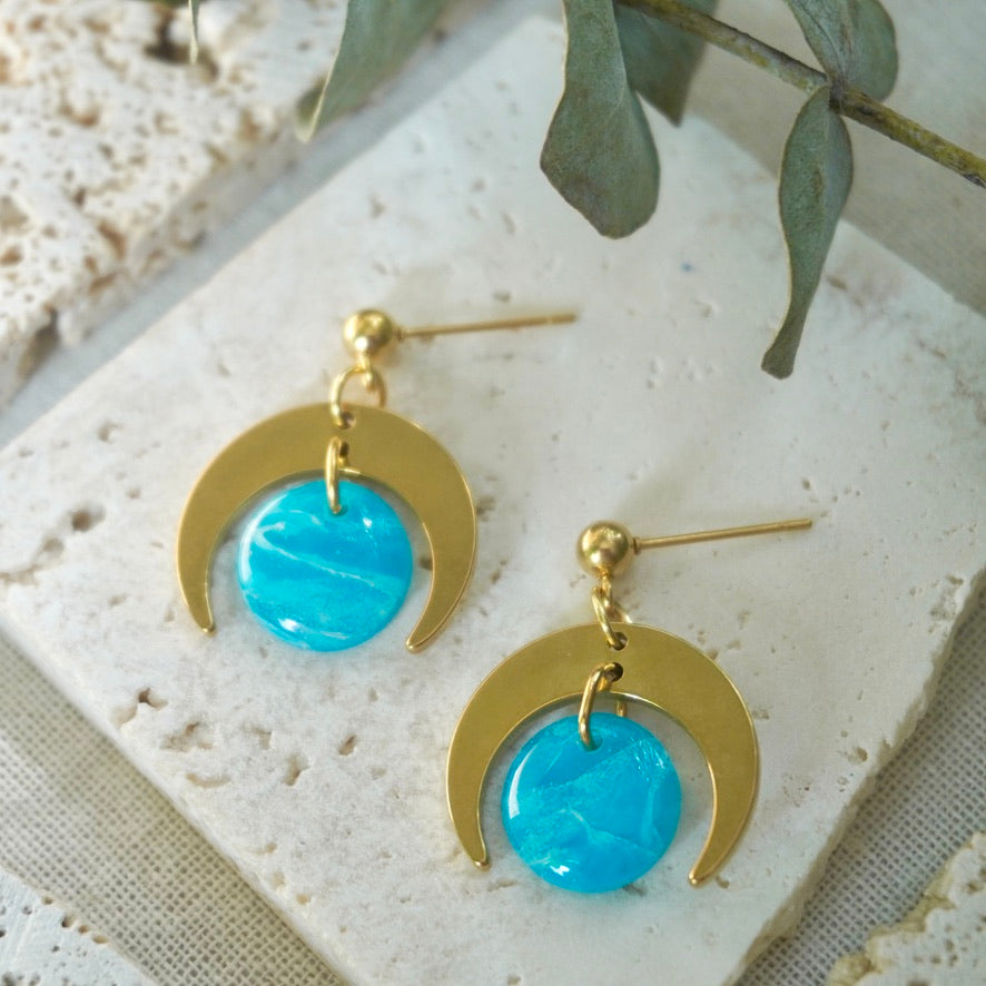 All of our jewellery is crafted by hand, so each has a unique finish making them one-of-a-kind pieces. The colour in the earring glows with vibrancy when the sun hits them.
