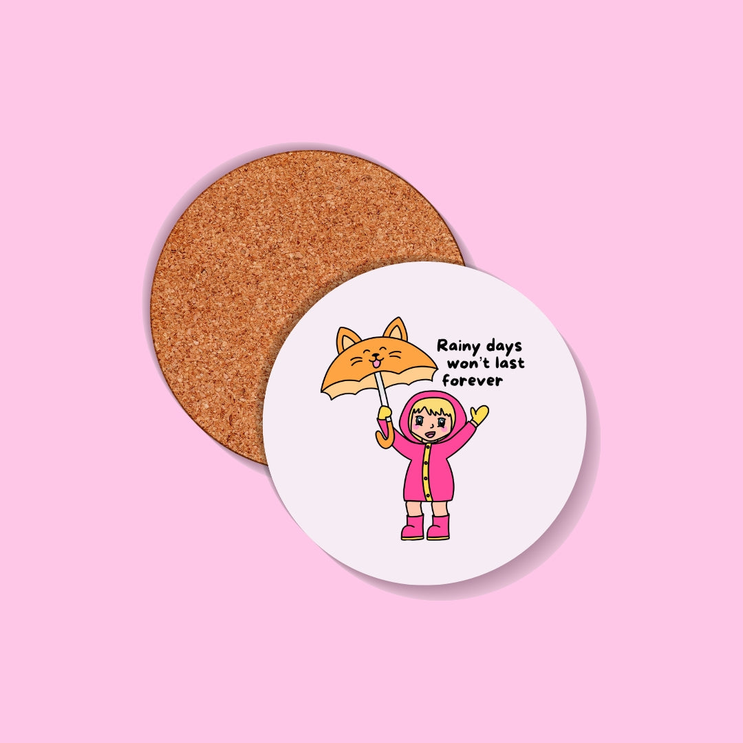Brighten even the cloudiest day with this utterly adorable coaster, featuring a sweet character in a cheerful pink raincoat holding a cute cat-faced umbrella! This charming design comes with an uplifting message: "Rainy days won't last forever," offering a little reminder of hope and sunshine to come.