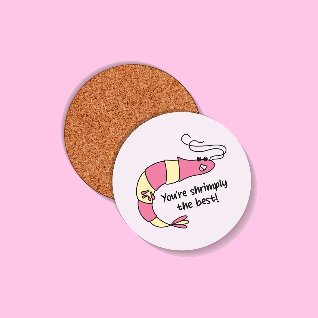 Let someone know they're truly appreciated with this adorable and witty coaster! Featuring a charmingly illustrated pink and yellow shrimp alongside the playful pun, "You're shrimply the best!", this coaster is sure to bring a smile to anyone's face.