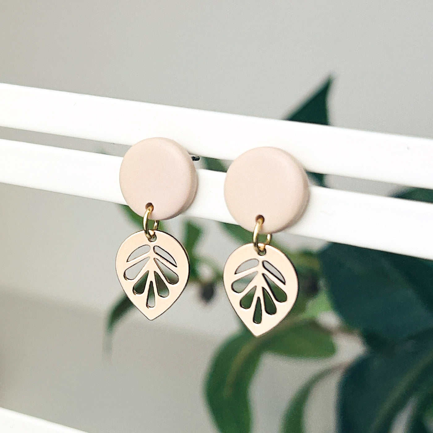 Small beige neutral stud and gold plated leaf earrings