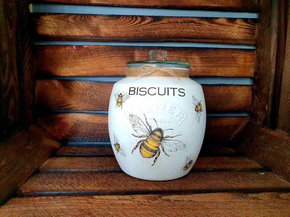 Tea, coffee and sugar, biscuit and utensil kilner jars with push fit lids. Painted and finished with Bee design