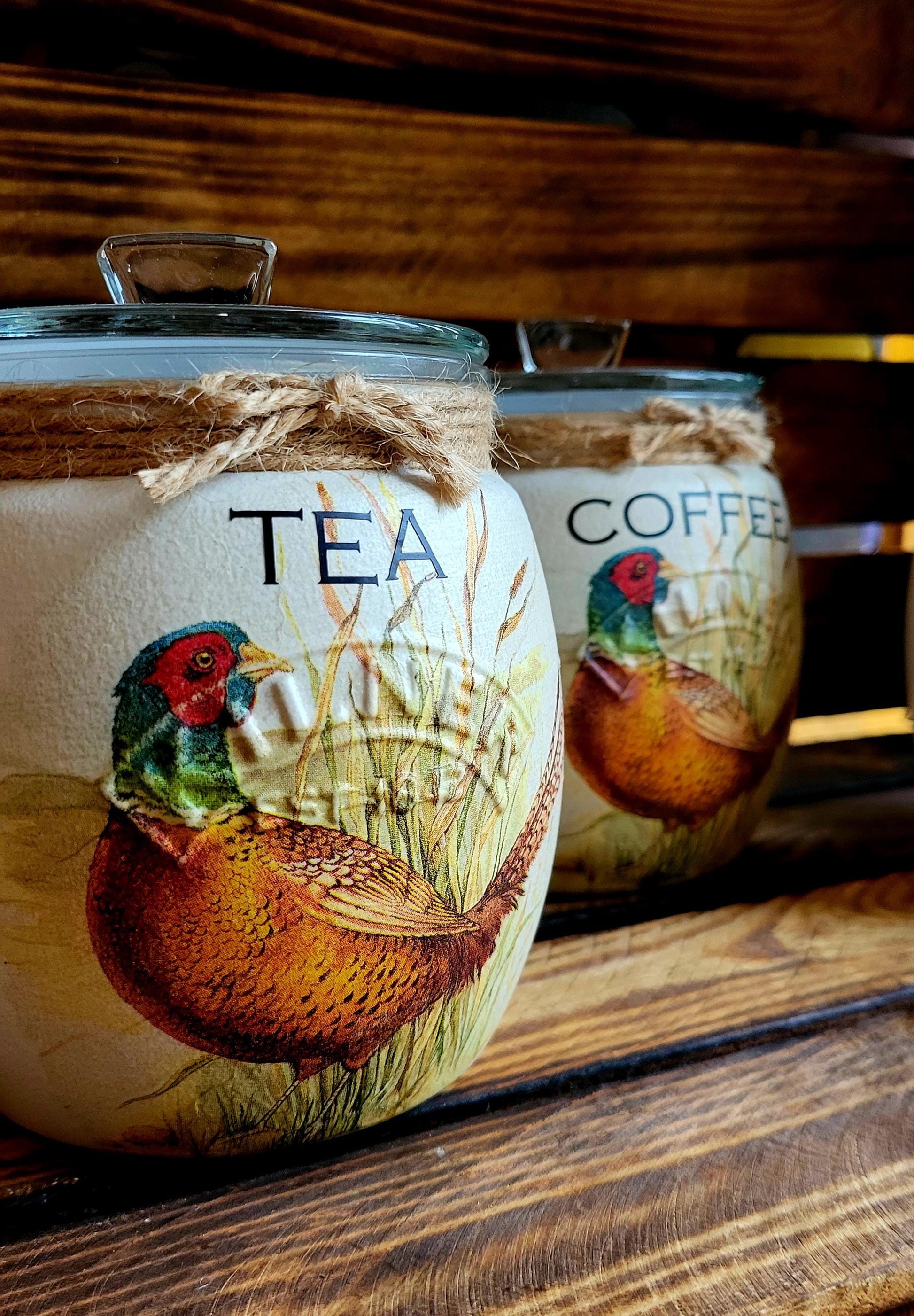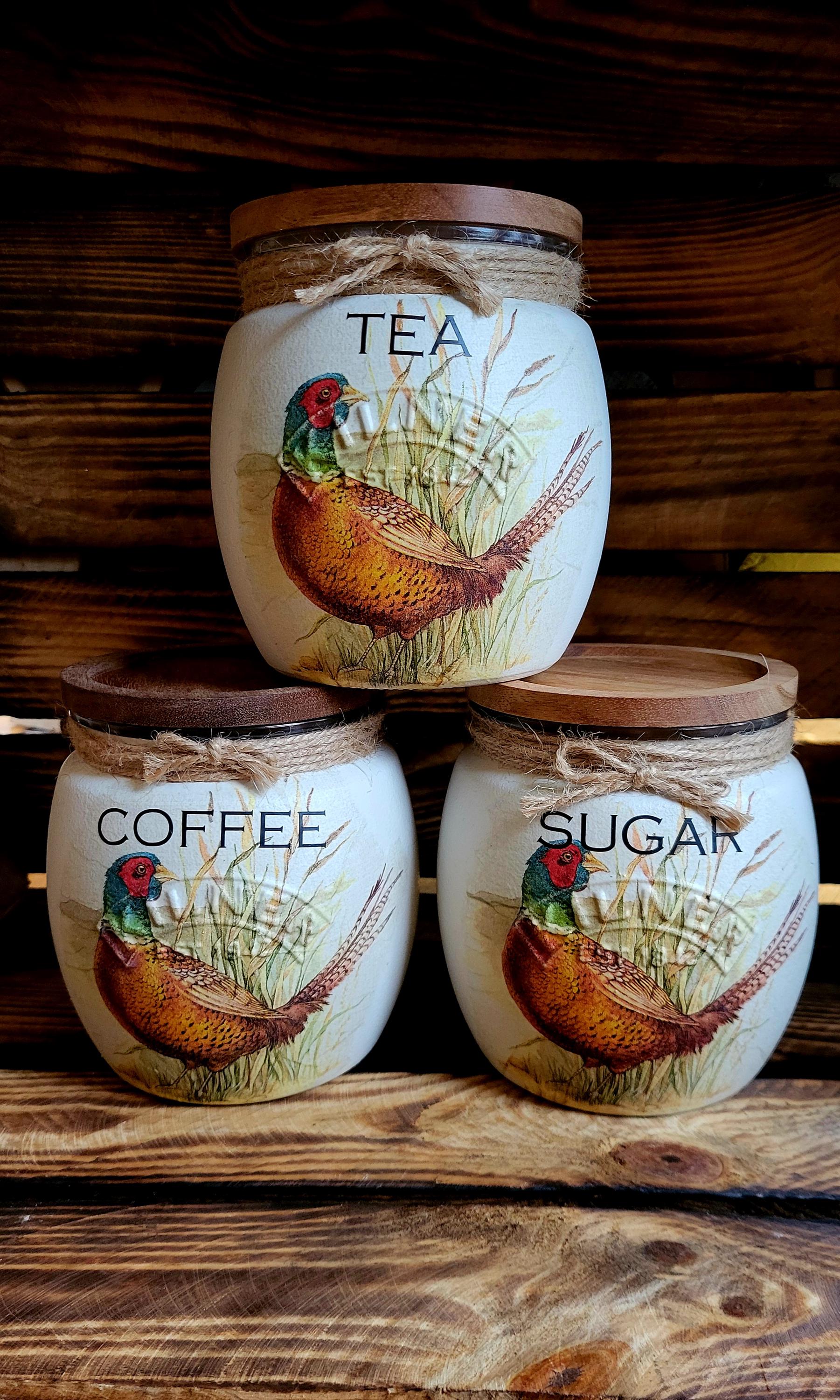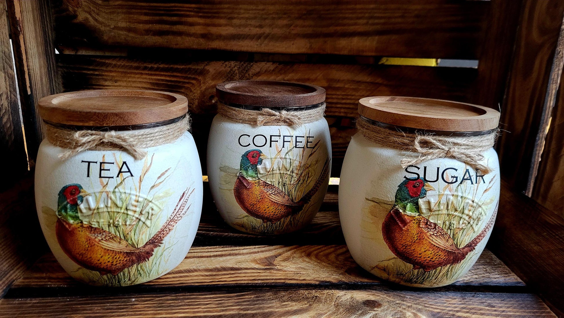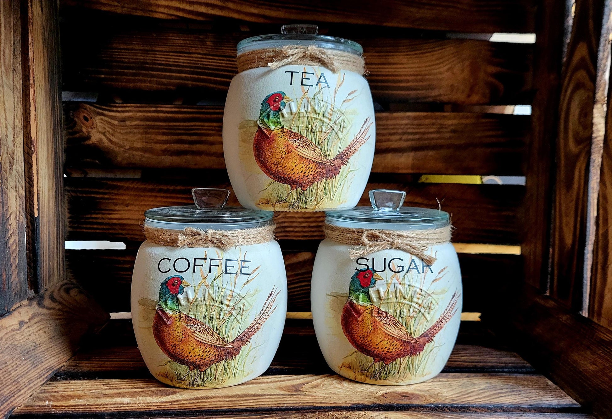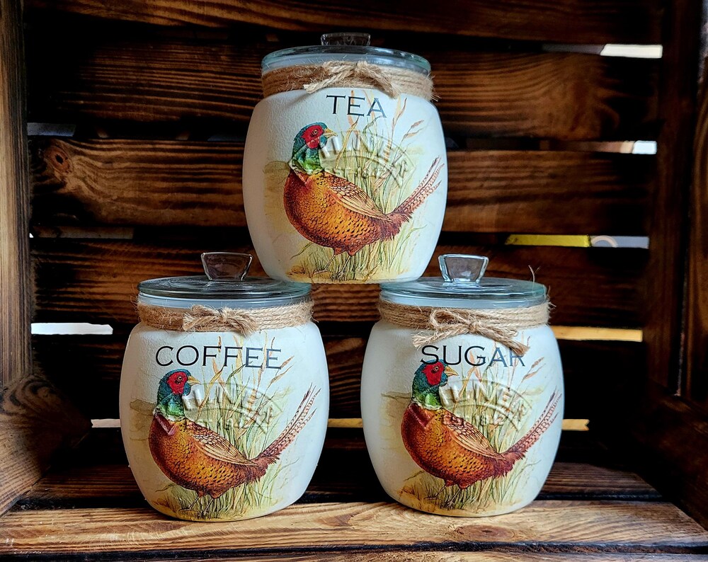 Tea, coffee and sugar, biscuit and utensil kilner jars with push fit lids. Painted and finished with Pheasant design.