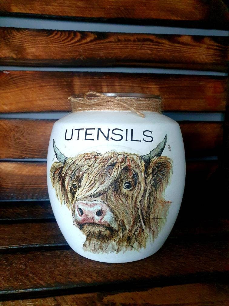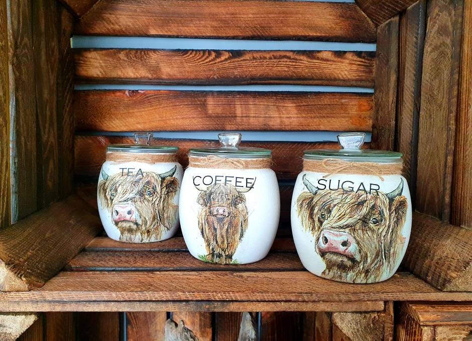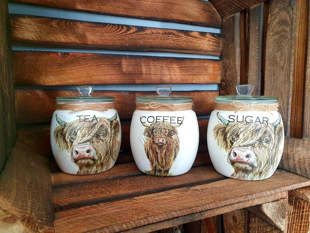Tea, coffee and sugar, biscuit and utensil kilner jars with push fit lids. Painted and finished with highland cow design