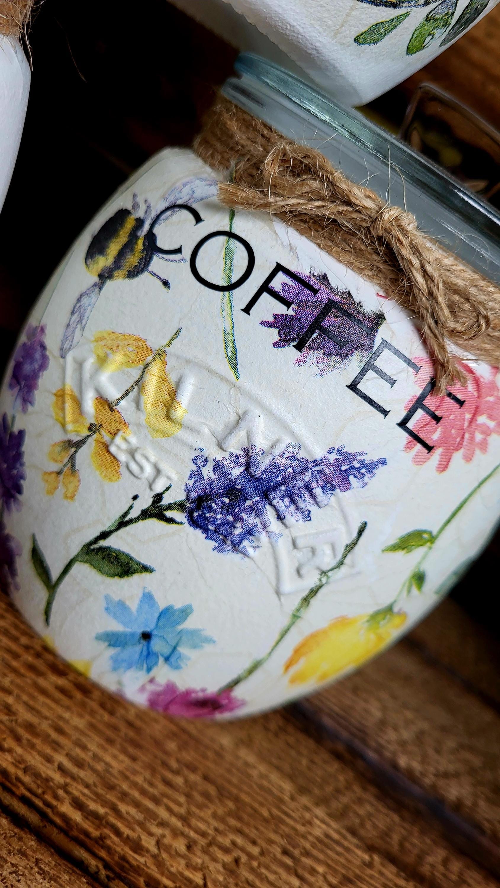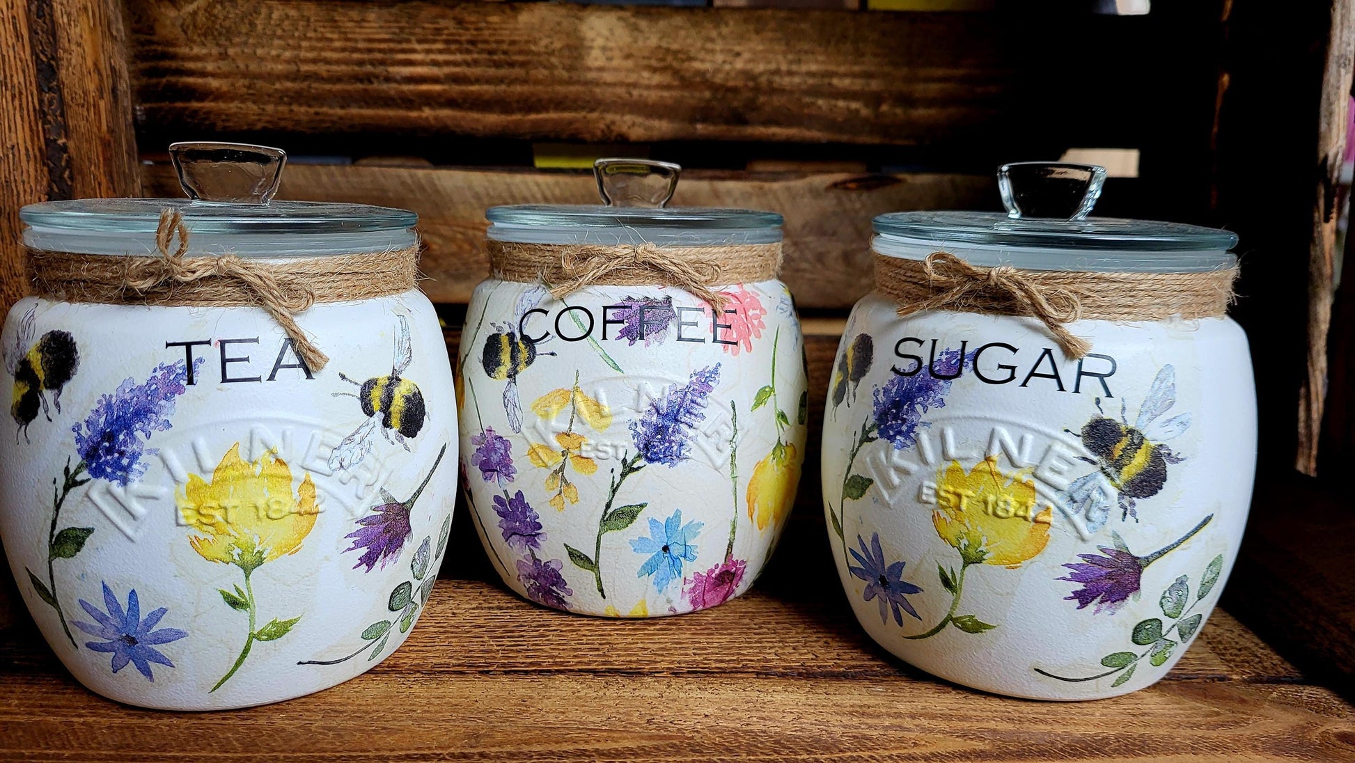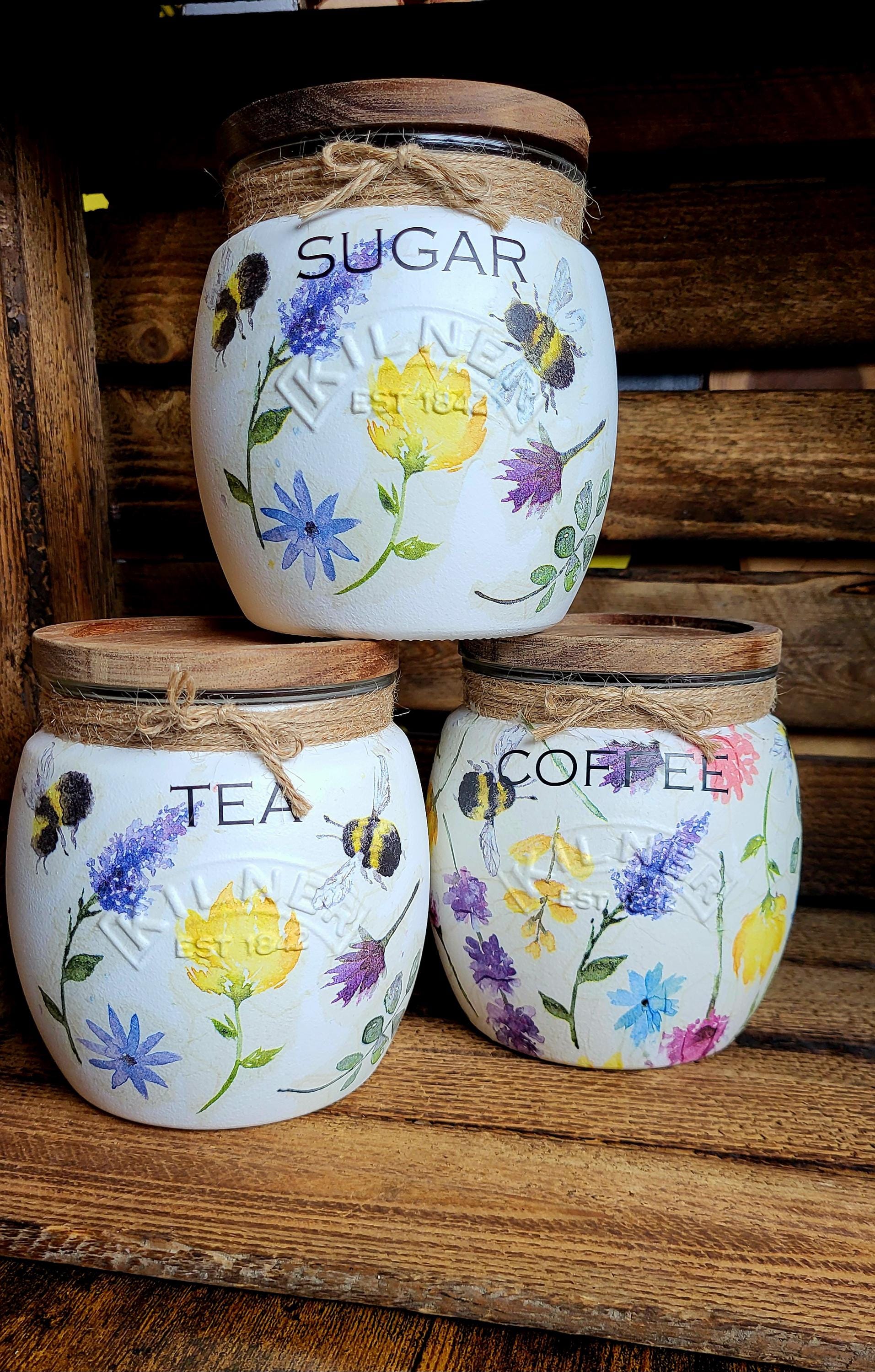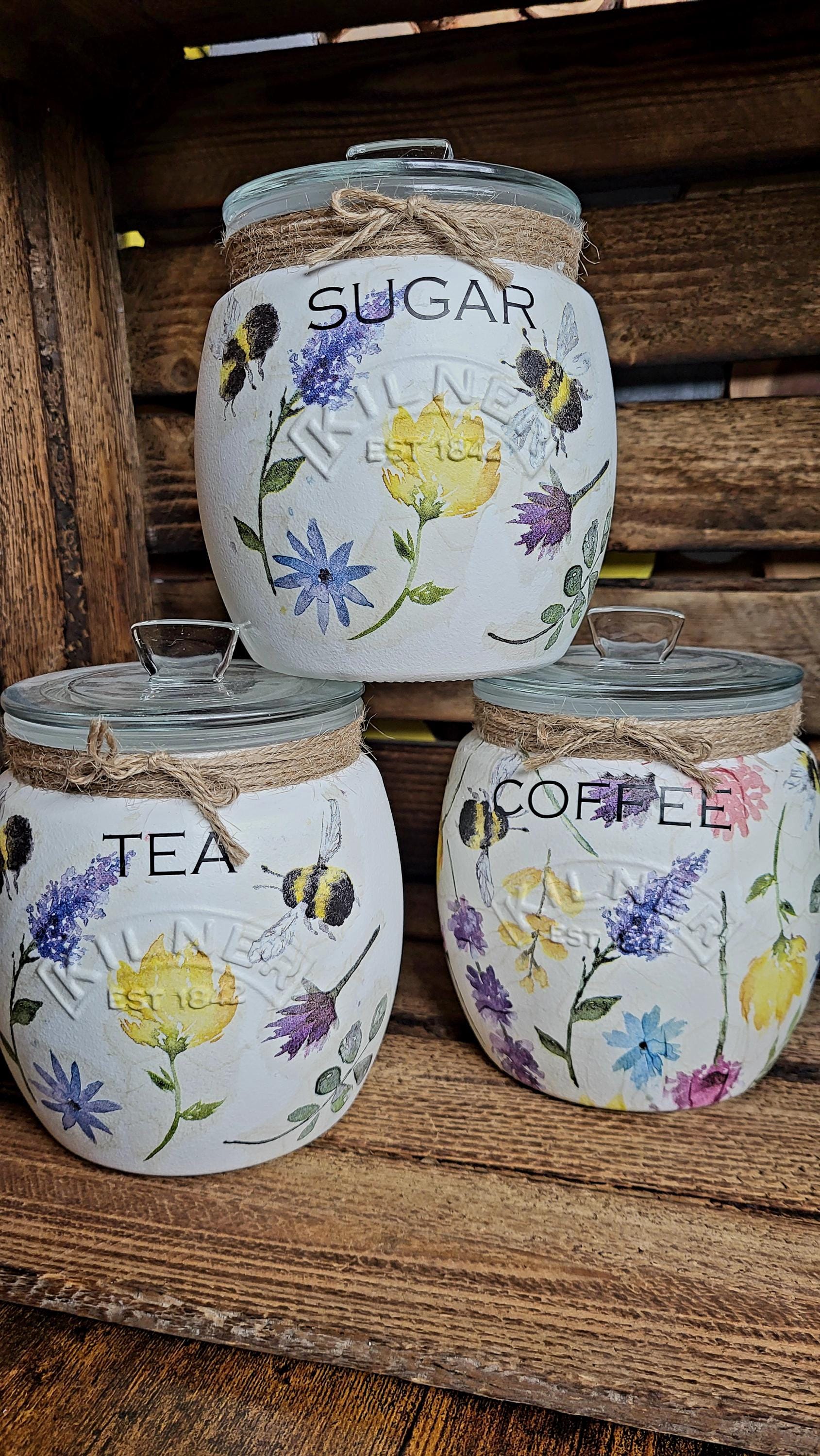 Tea, coffee and sugar, biscuit and utensil kilner jars with push fit lids. painted and finished in a stunning summer meadow design with wording of your choice. Order options - ♡ Single 0.85L Jar, please add a note in comments with your wording choices. ♡Set of 3 x 0.85L Jars, sent standard as Tea, coffee, sugar. ♡Set of 3 x 0.85L Jars + 1 x 2L Biscuit Jar, sent as standard, Tea Coffee, Sugar, Biscuits. ♡ 2L Biscuit Jar ♡ 2L Utensil Jar Please add any wording changes in the comments section at checkout. Not suitable for the Dishwasher, do not submerge in water, wipe clean only. Matching items available to purchase x