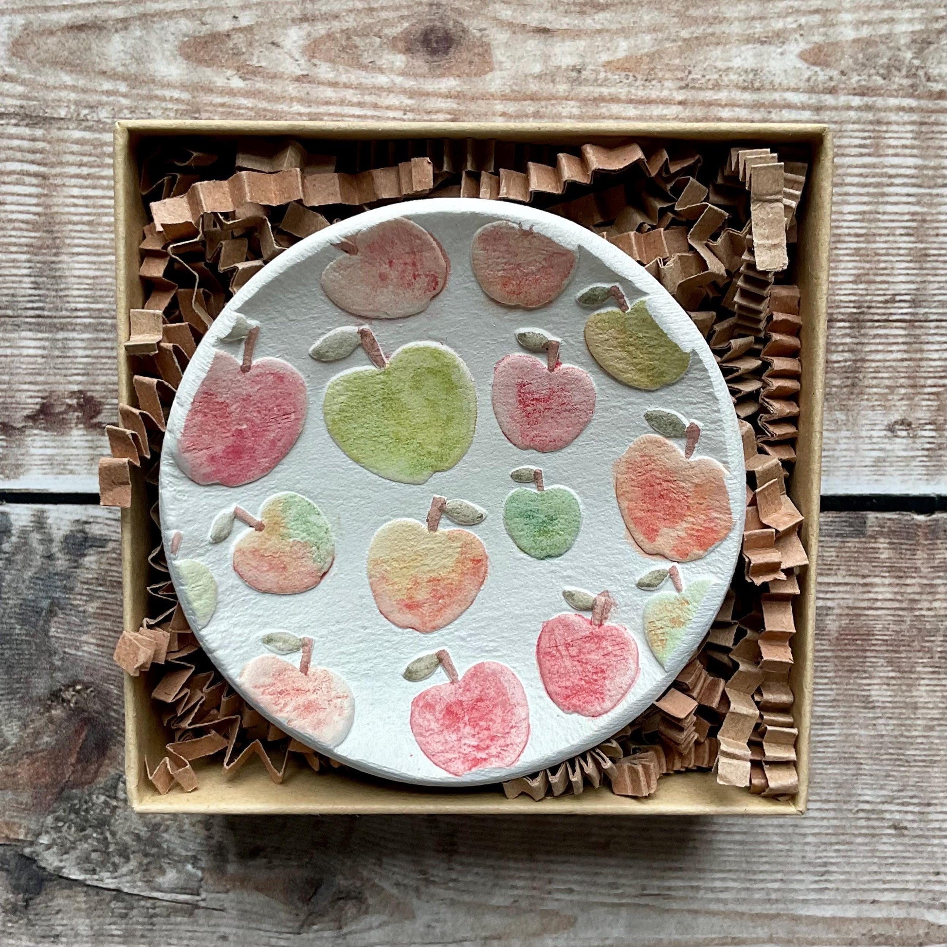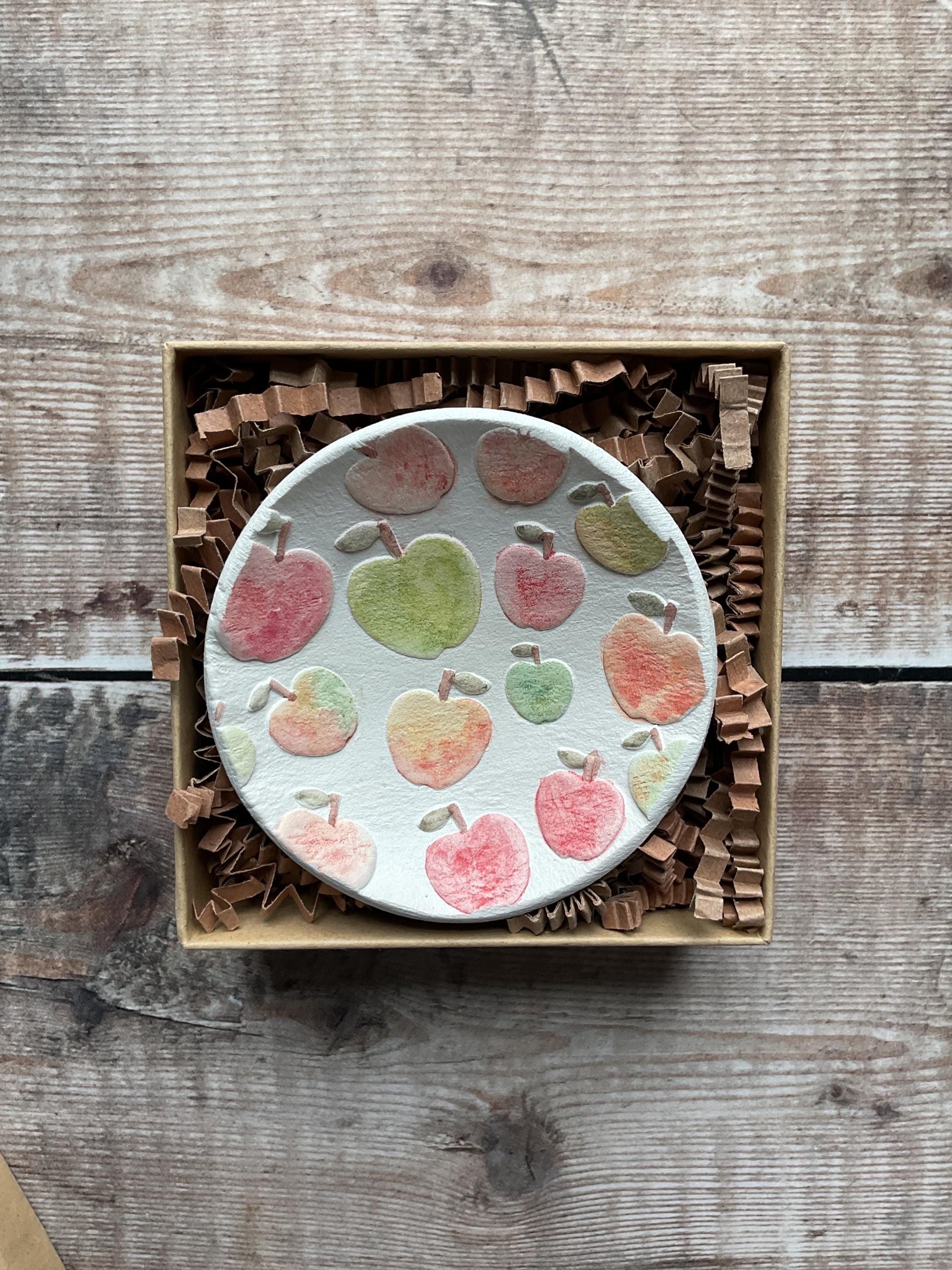 This beautiful trinket dish has been handmade from clay, with a pattern of rustic apples, hand painted in watercolours. It has a diameter of approx 8cm/3inches and sits neatly on a shelf, dressing table or desk. Whether used for jewellery or paper clips, it’s a beautiful and useful home for small trinkets that may otherwise be lost!