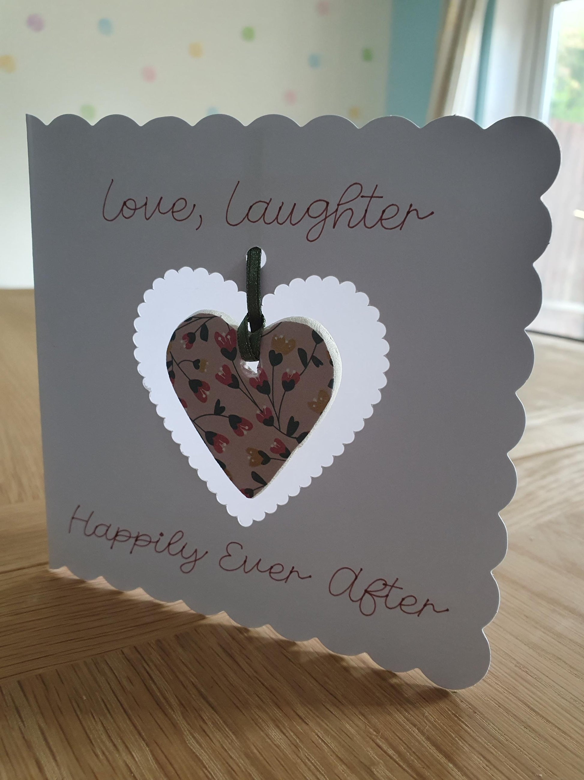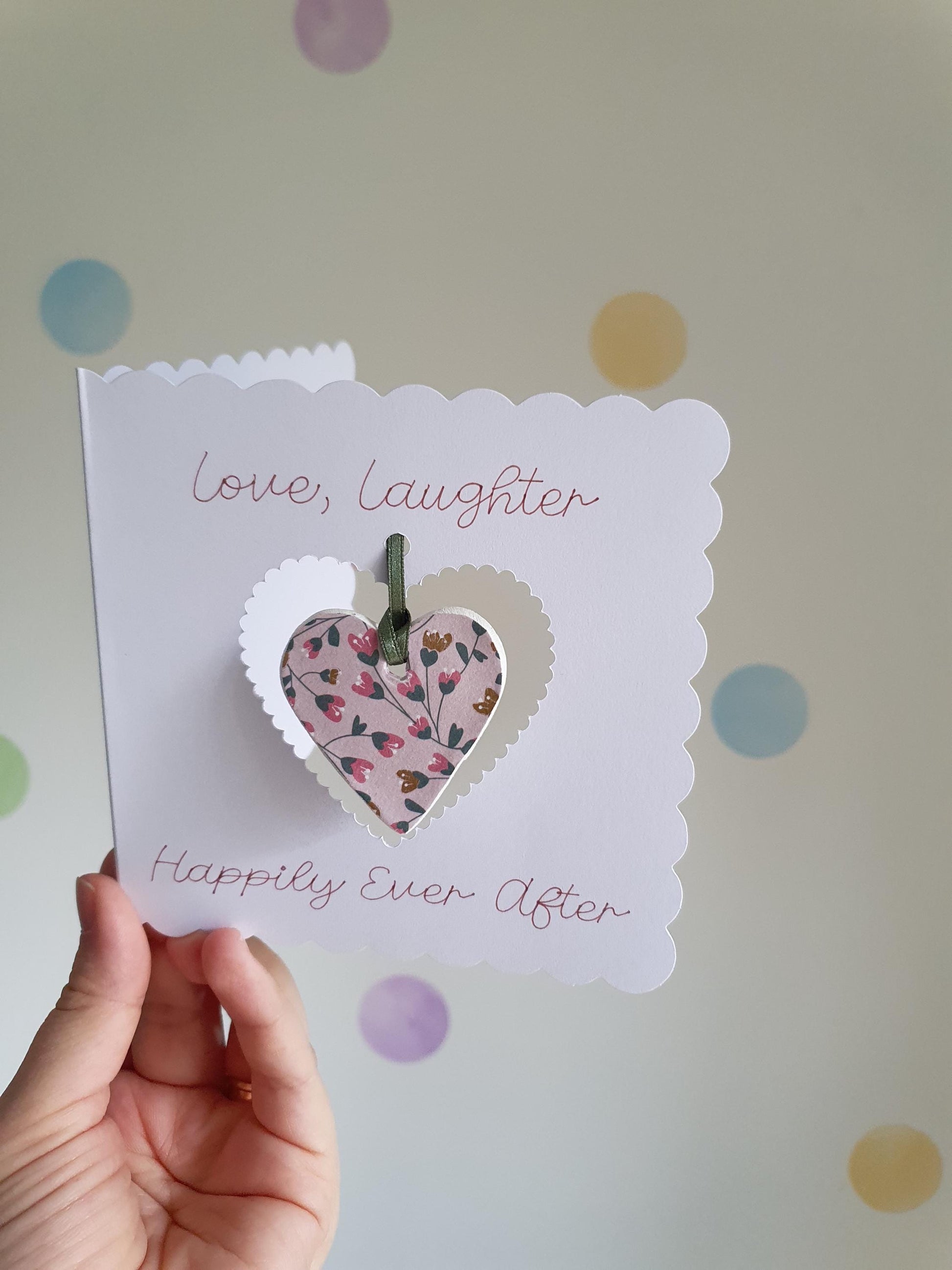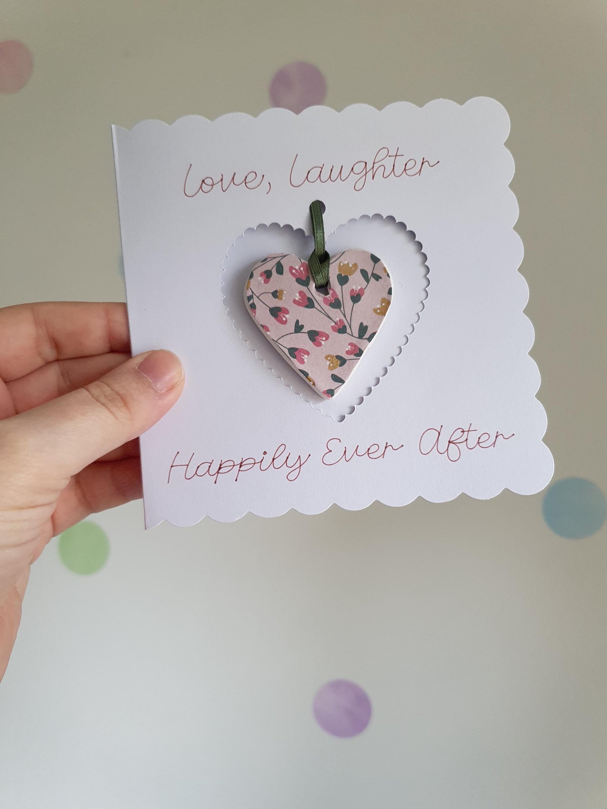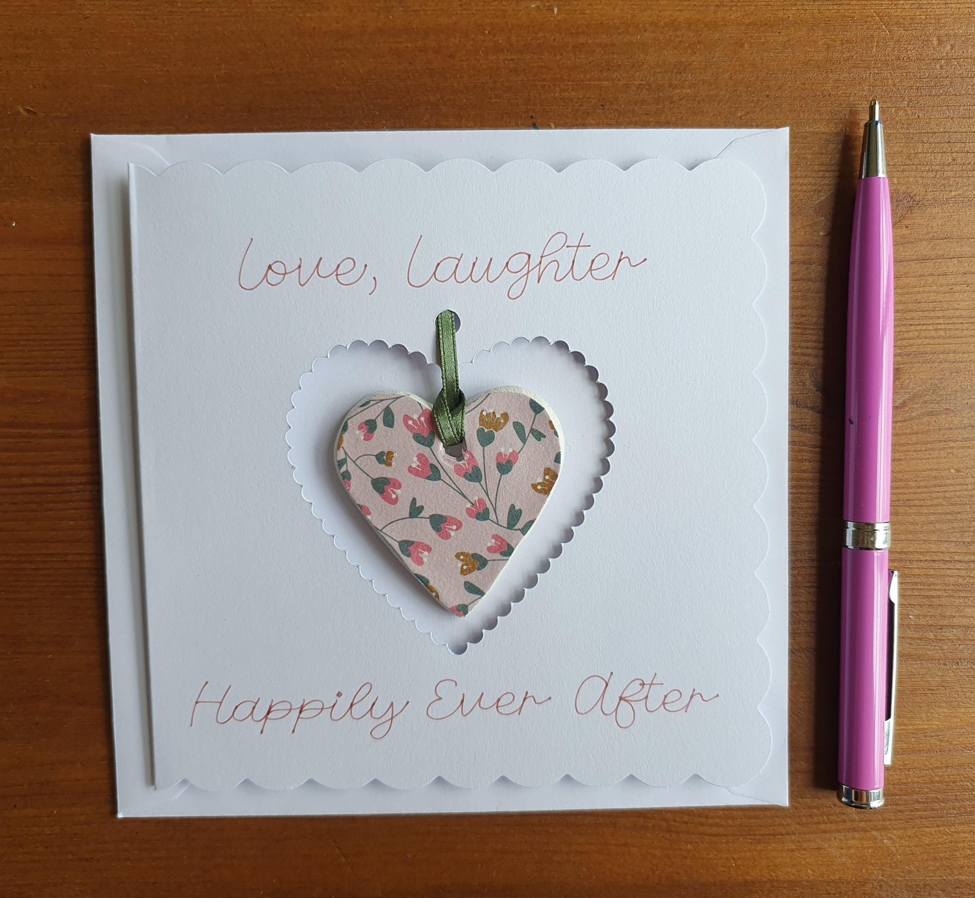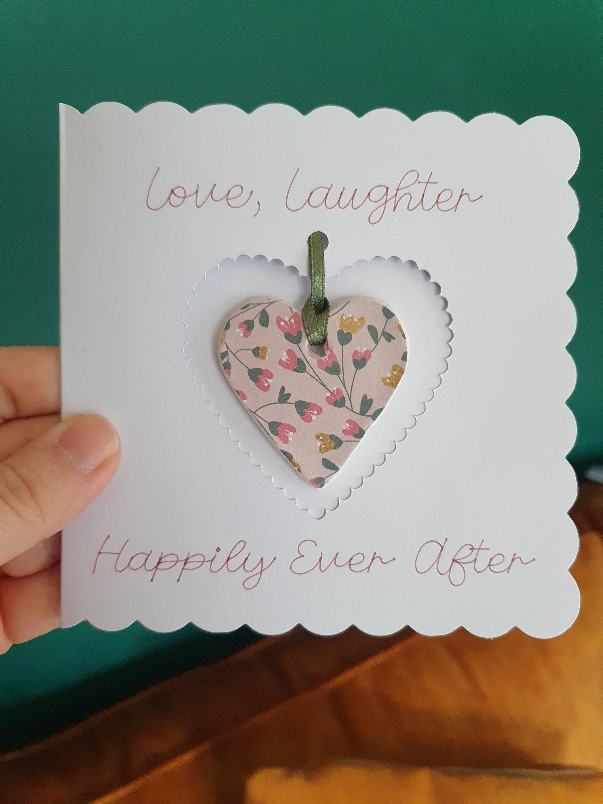 This listing is for the Wedding/Engagement/Anniversary card, featuring a pretty pink floral print clay heart with gold foil detail and green ribbon, framed inside a scalloped card with text that reads “Love, Laughter, Happily Ever After”