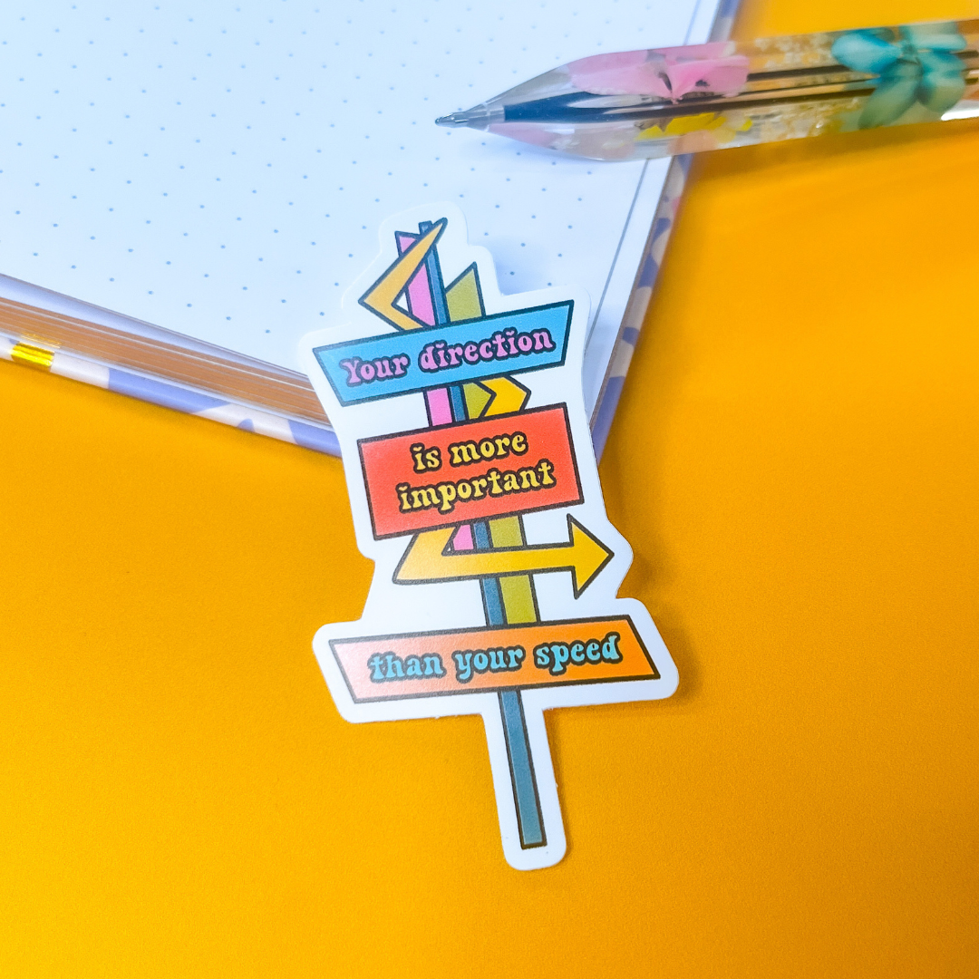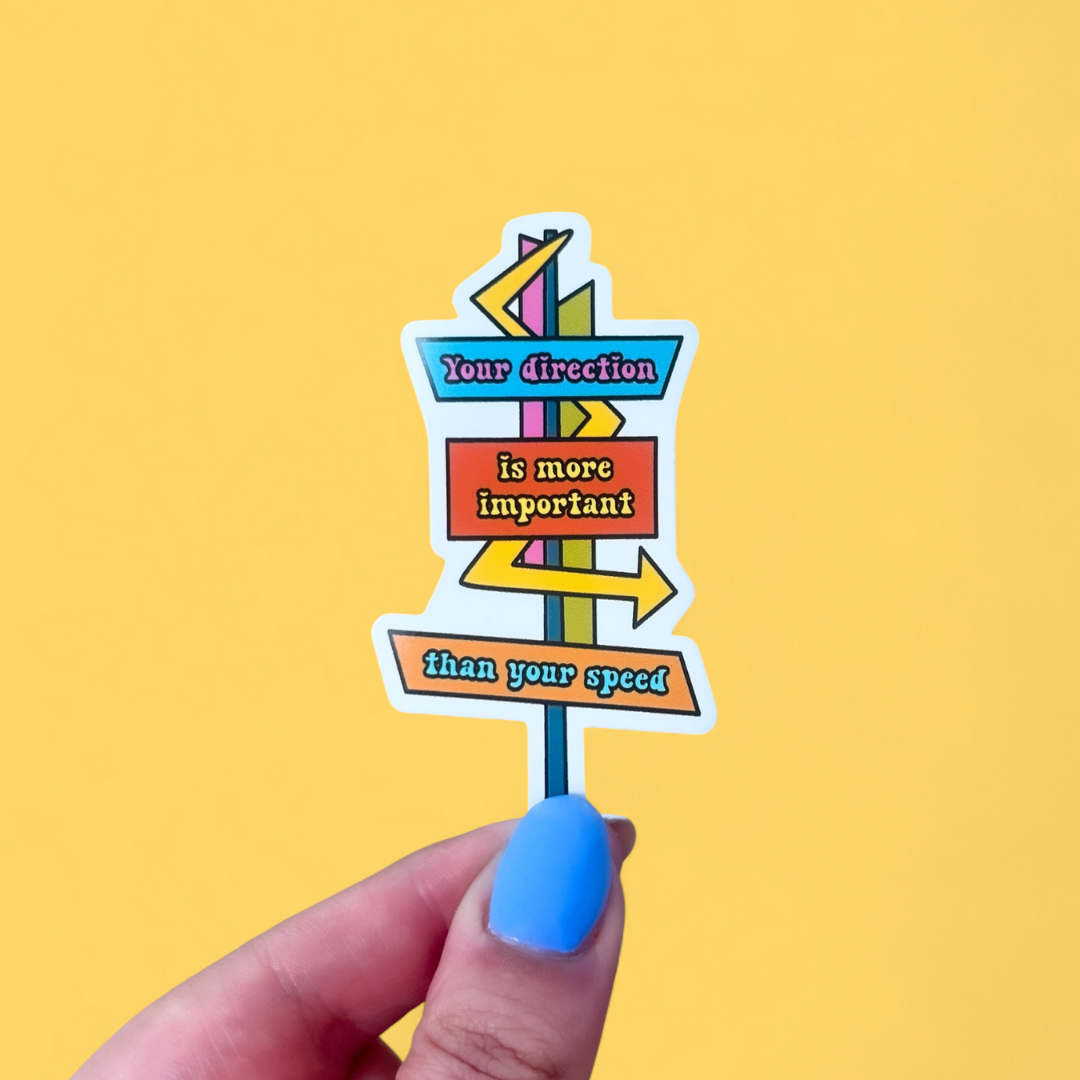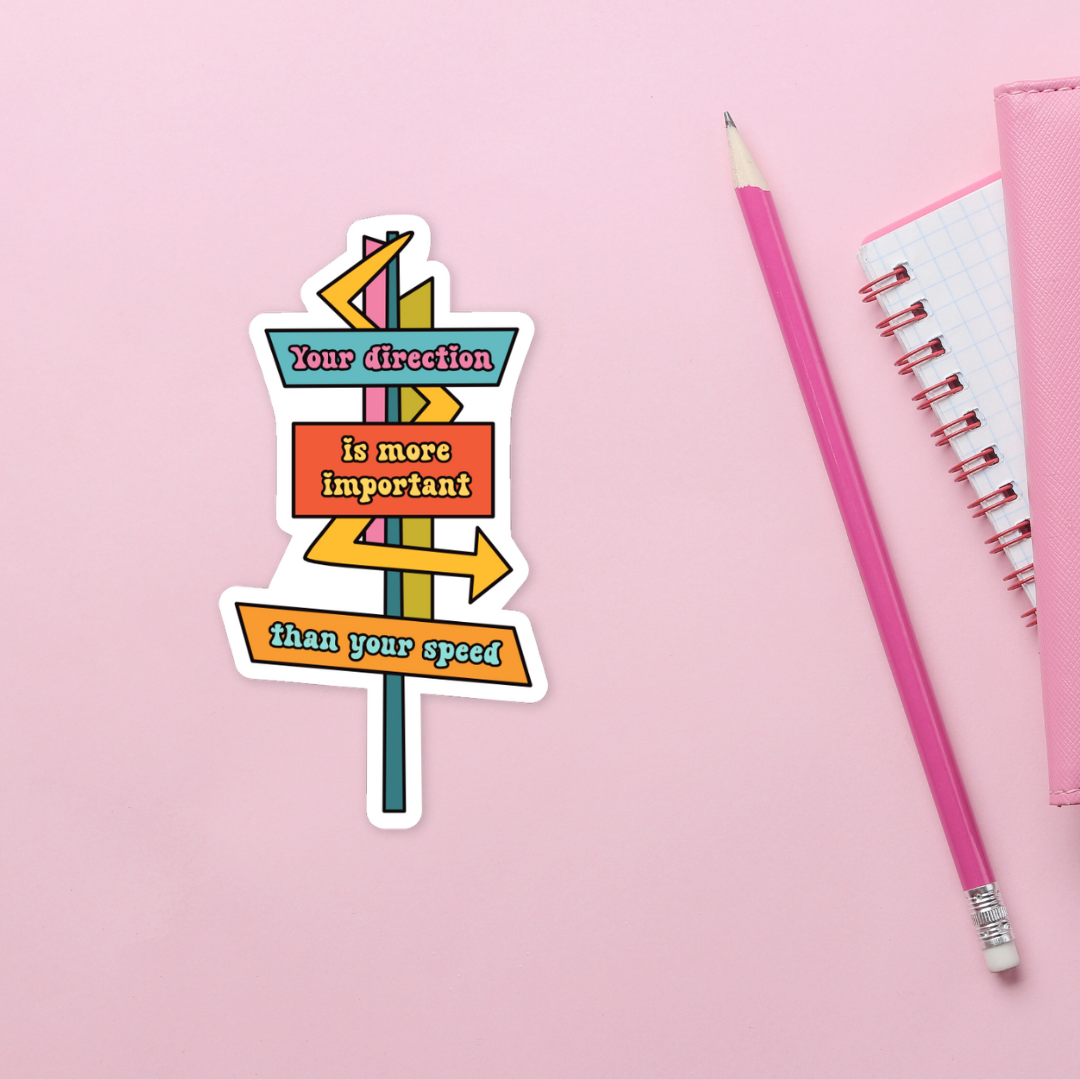 Your Direction Is More Important Than Your Speed – the perfect reminder to take things at your own pace and focus on the journey, not just the destination. With its retro sign illustration, this sticker celebrates the importance of thoughtful progress over rushing through life.